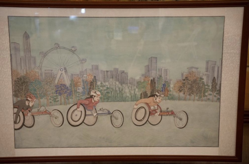 冯银妹创作的巨幅工笔画《轮翼追光—赛道上的逆行者》以工笔重彩的技法,定格了赛场上震撼人心的瞬间。笔触细腻而富有力量,将残疾人运动员“更快、更高、更强——更团结”的奥林匹克精神,在画布中传递。