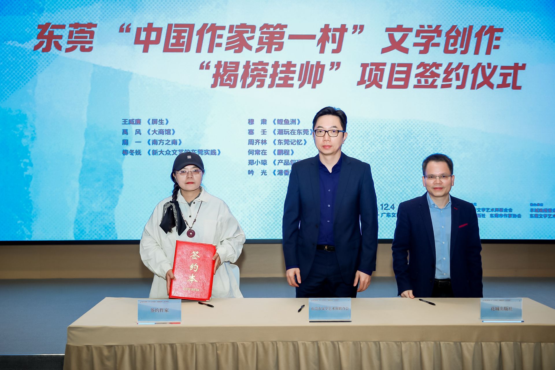 现场,“中国作家第一村”文学创作“揭榜挂帅”项目签约仪式。在与会者的见证下,王威廉、禹风、柳冬妩、周一、塞壬、穆肃、周齐林等入选作者分批上台签约。这个自今年7月启动的项目,共收到百余位创作者的积极响应,最终10部优秀作品脱颖而出,涵盖现实题材、乡土文学、城市书写等多个领域,既展现了东莞文学创作的蓬勃生机,又具备了不拘一隅的文学视野。