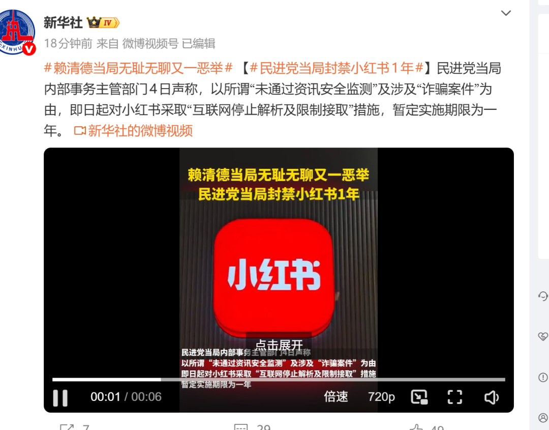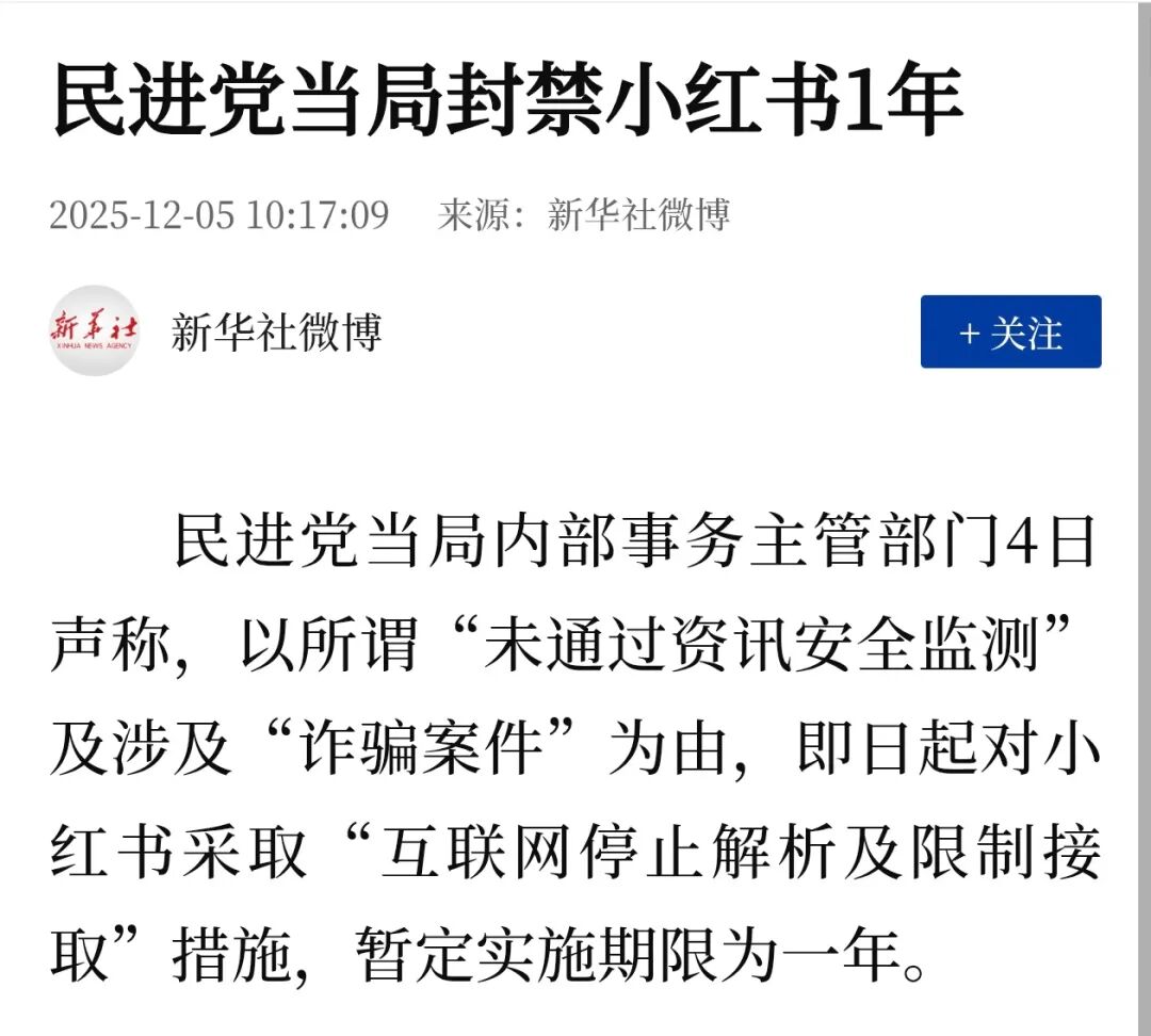 民进党当局内部事务主管部门4日声称,以所谓“未通过资讯安全监测”及涉及“诈骗案件”为由,即日起对小红书采取“互联网停止解析及限制接取”措施,暂定实施期限为一年。