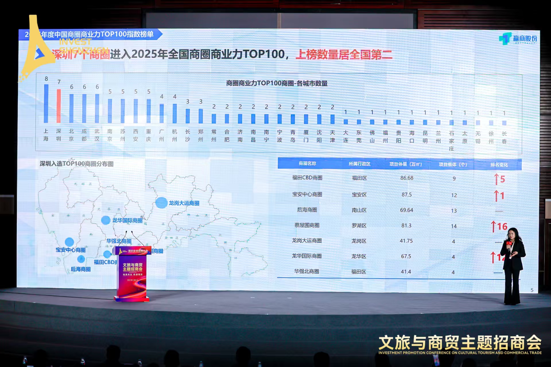 活动现场,赢商网发布了《2025年全国商圈商业力Top100指数榜单》,为行业发展提供权威指引。榜单显示,深圳福田CBD商圈、宝安中心商圈、后海商圈、蔡屋围商圈、龙岗大运商圈、龙华国际商圈、华强北商圈共7个商圈进入2025年全国商圈商业力TOP100,上榜数量居全国第二。