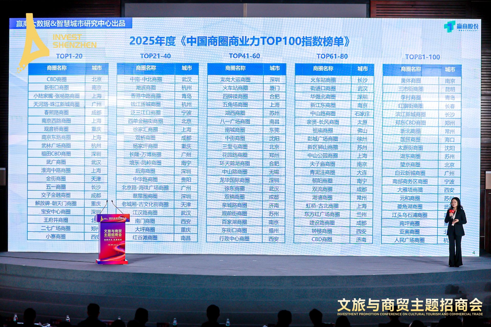 活动现场发布《2025年全国商圈商业力Top100指数榜单》,为行业发展提供权威指引。榜单显示,深圳福田CBD商圈、宝安中心商圈、后海商圈、蔡屋围商圈、龙岗大运商圈、龙华国际商圈、华强北商圈共7个商圈进入2025年全国商圈商业力TOP100,上榜数量居全国第二。