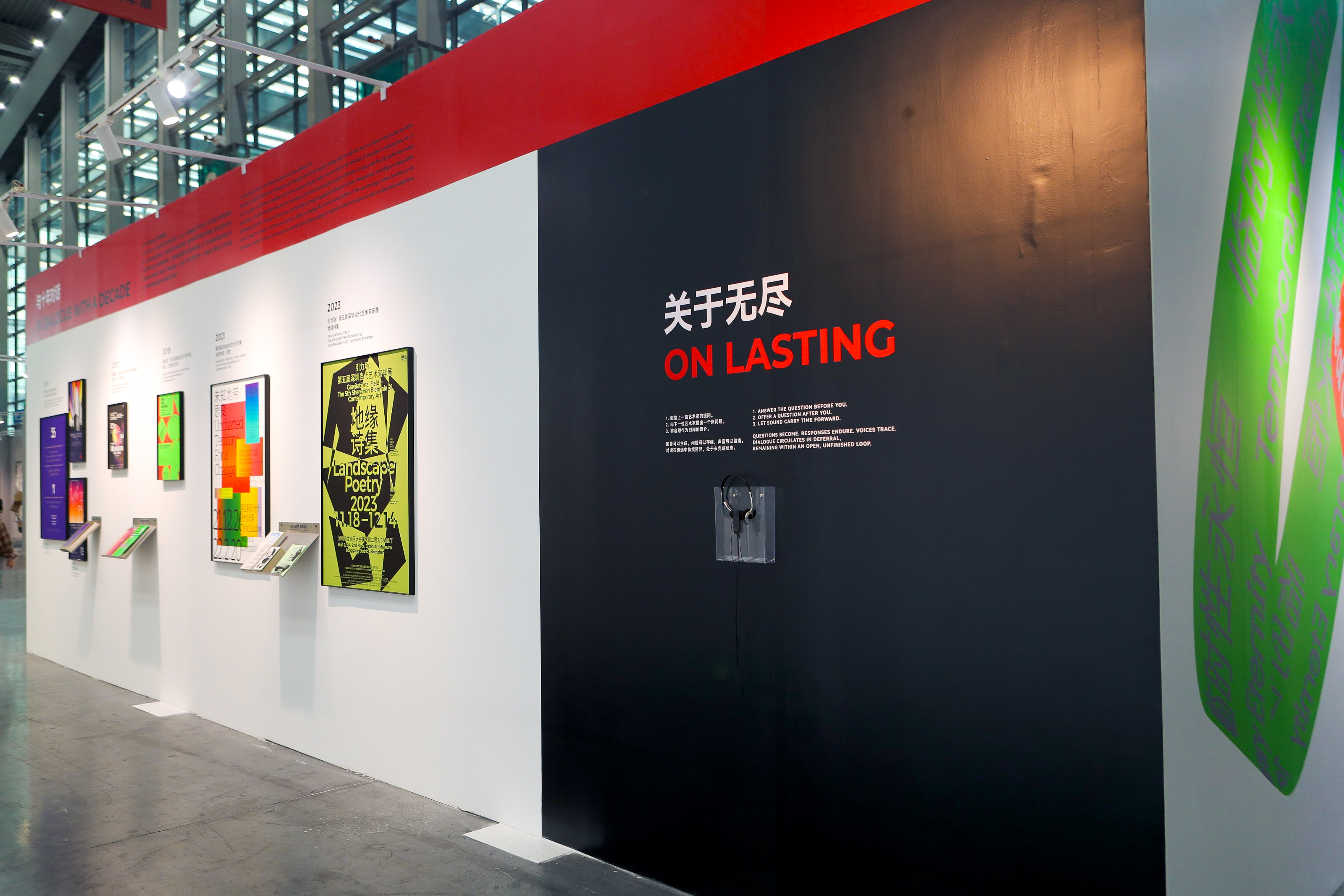 此外,展览同步呈现“与十年对话:第1-5届深圳当代艺术双年展回顾”,系统梳理前五届视觉体系、主题框架与研究成果,展现该展事在公共文化艺术平台建设方面的持续性与前沿性;“关于无尽:艺术家线上循环问答”项目,全体参展艺术家以循环式提问与回应的方式在多个时间切片中展开对话。这一持续对话不仅作为展览的思维延展,也构成未来的知识留痕档案,回应“如何在临时中建构文化的时间性”的核心命题,进一步增强展览的学术延展性与社会参与度。