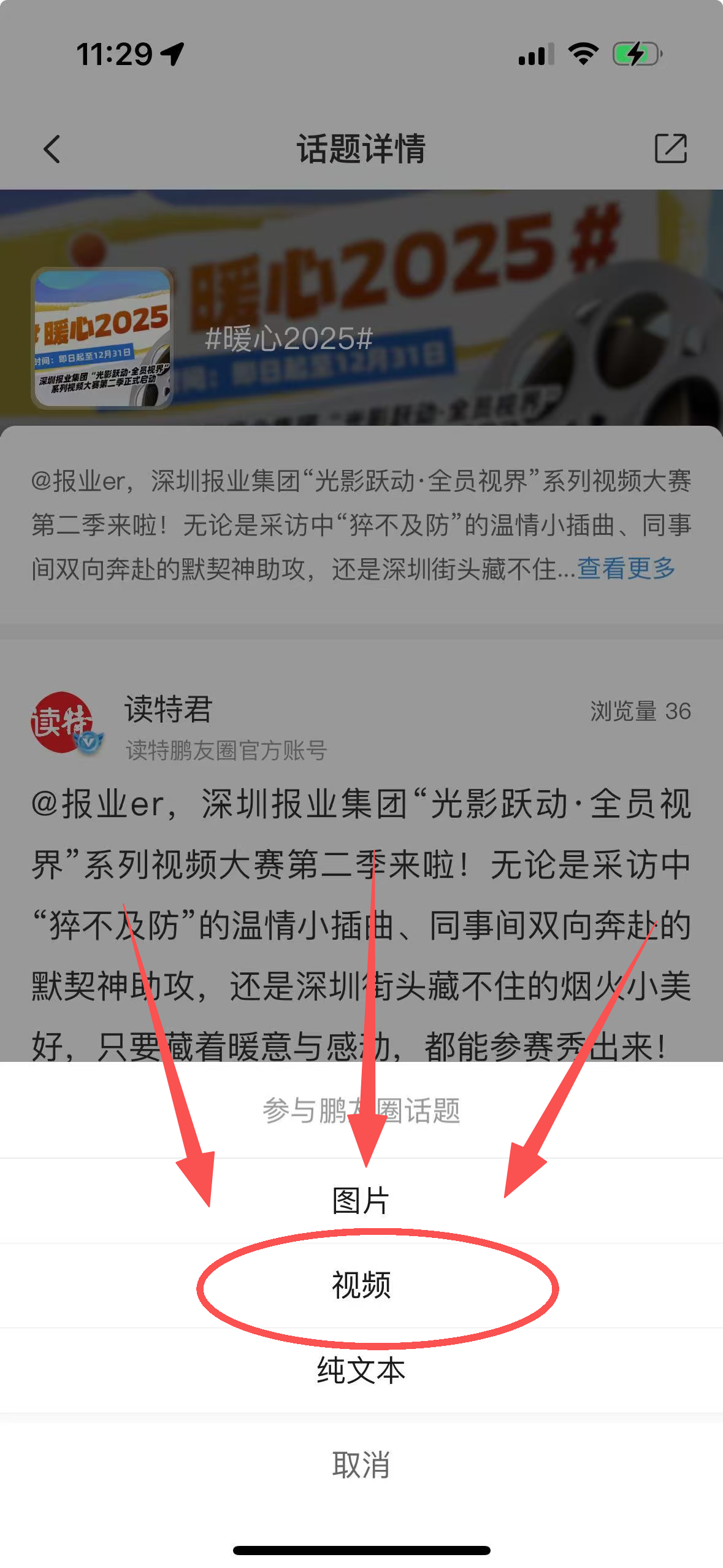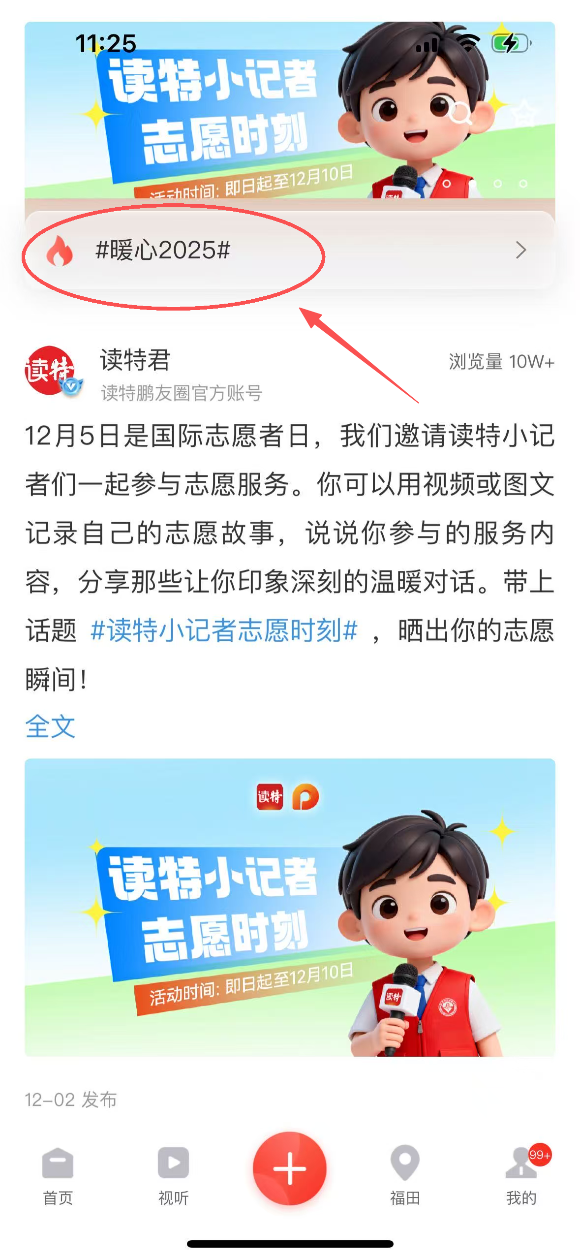 1.线上提交:在读特客户端“鹏友圈”发布视频,并添加话题 #暖心2025#;