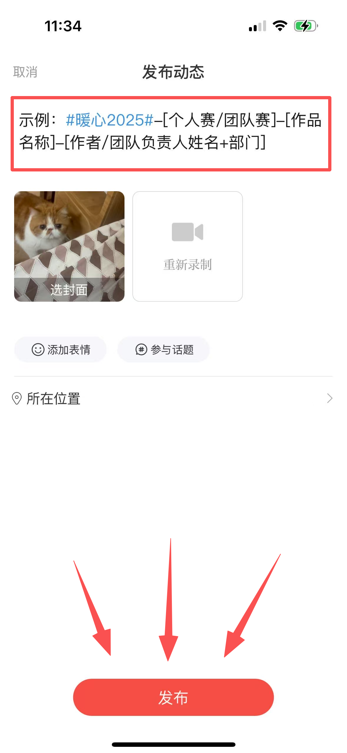 7. 根据参赛形式(个人赛/团体赛),编写文案(标题、内容)并带上相应的话题标签,文案格式示例:【#暖心2025#】- [个人赛/团队赛] - [作品名称] - [作者/团队负责人姓名+部门],点击页面底部“发布”按钮,完成操作。
