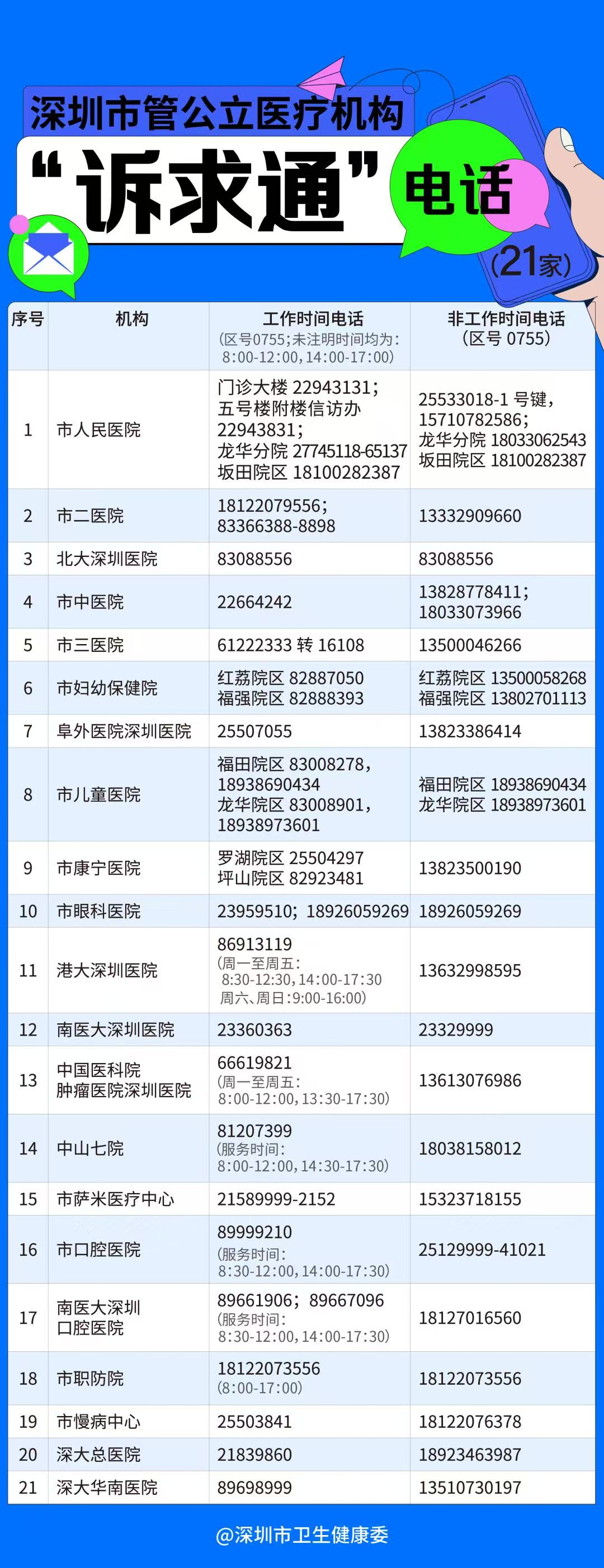 医疗纠纷是深圳医疗健康行业的“投诉大户”,为了方便解决医患纠纷,深圳市卫生健康委在全市21家市管公立医院设立“诉求通”二维码,市民只需要扫码写下你的诉求和联系方式,医院信访部门工作人员就会在10分钟内签收、30分钟内联系你。
