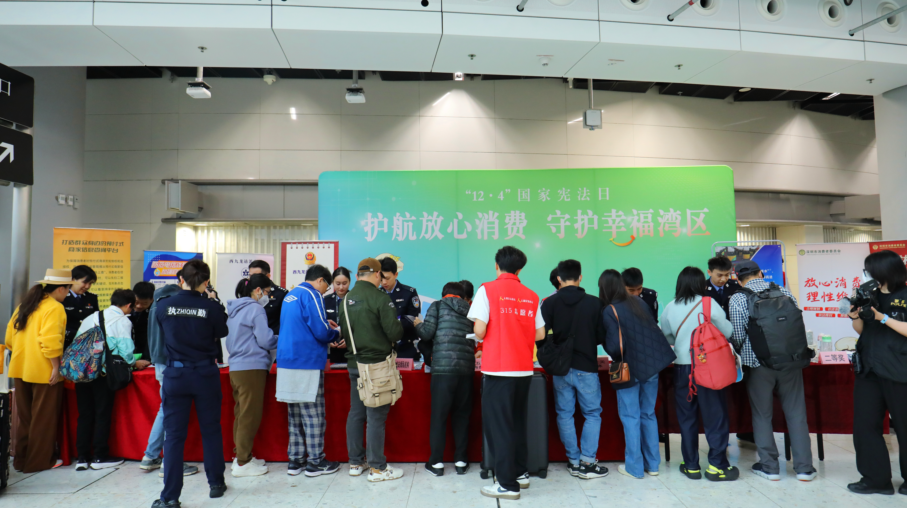 今年12月4日是第十二个国家宪法宣传日,深圳市消委会联合深圳铁路公安处、深圳缉私局在香港西九龙高铁站举办“护航放心消费 守护幸福湾区”主题活动,将宪法普及与消费教育深度融合,通过实体化、场景化的方式,为深港跨境旅客提供精准消费资讯与普法帮助。现场设置展板和法律咨询,并设计以人生阶段为脉络的“闯关问答游戏”,从“出生、上学、上班、出行、消费、退休”等环节,生动阐释宪法对消费者权益等公民权利的根本保障。同时,大力普及《中华人民共和国消费者权益保护法》《中华人民共和国消费者权益保护法实施条例》《深圳经济特区消费者权益保护条例》及反诈骗技巧,将法律知识转化为实用“盾牌”,提升跨境消费者的法治素养与自我保护能力。