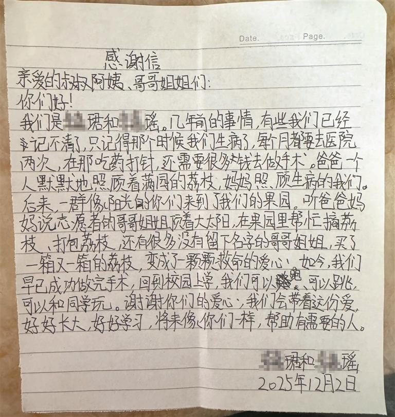 “几年前的事情,有些我们已经记不清,只记得那个时候我们生病了……爸爸一个人默默地照顾满园的荔枝,妈妈照顾生病的我们。”当天,瑶瑶和珺珺还诵读了提前写好的感谢信,语言稚嫩但满是感激,“后来,像阳光的你们来到了我们的果园……如今,我们早已做完手术,回到学校上学,我们可以跑、可以跳,可以和同学玩。”