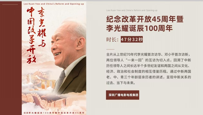 2023 年是中国改革开放45周年,也恰逢李光耀先生100周年诞辰,深圳广播电影电视集团联合中国驻新加坡大使馆,打造了兼顾国内、国际传播效果的电视纪录片——《李光耀与中国改革开放》,时长47分钟,致敬在中国改革开放的进程中给予帮助的国际友人。