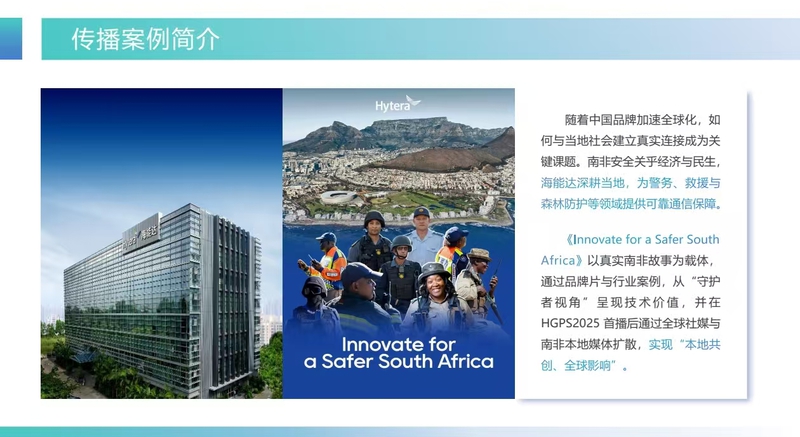 《Innovate for a Safer South Africa》是一项以真实案例为核心的国际传播项目,通过短视频、稿件、峰会等形式立体传播触达。主旨及案例系列视频通过纪录式故事呈现海能达通信技术在南非公共安全体系中的巨大社会价值。项目以“守护者视角”取代传统产品叙事,与城市警务团队、应急救援队、消防员护林员一道,见证通信技术如何赋能城市救援与社会治安、森林防火、野生动物保护。该传播项目以一支品牌主片串联多个垂直行业案例,品牌片在海能达全球合作伙伴峰会(HGPS2025)首播,结合社媒发布、稿件传播等形式,形成“理念- 实践- 国际传播”的完整传播链路,并在南非本地媒体和目标受众中广泛曝光,实现“本地共创、全球传播”(be global,golocal)。
