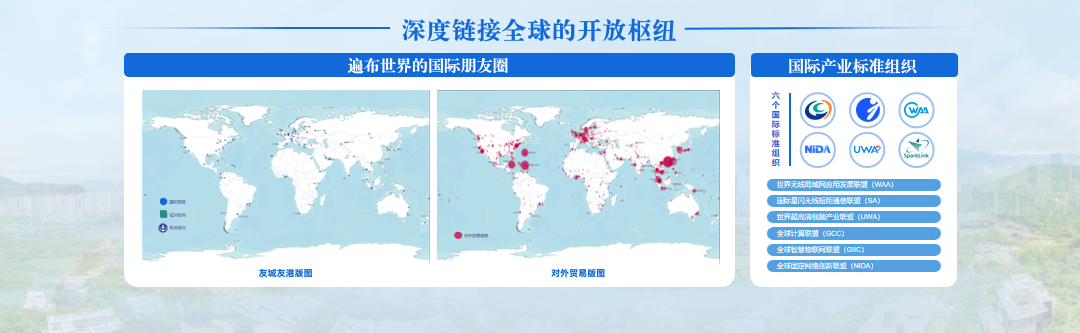 深圳拥有遍及全球的友好城市、友好港口,众多海外商会协会、经贸代表处、创新中心、制造基地和企业营销网络,已落地6家国际性产业与标准组织。