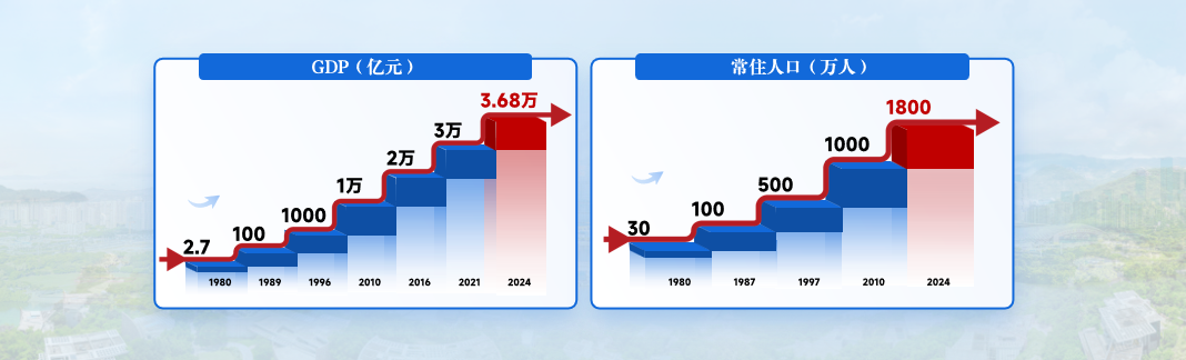 深圳GDP从1980年的2.7亿元,到2024年超3.68万亿元,总量居中国第三、全球前十;常住人口从1980年的30万人,到2024年超1800万人。