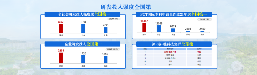 2024年,深圳地区生产总值达3.68万亿元,总量居中国第三、全球前十,全社会研发投入达2453.1亿元,研发投入强度达6.67%、跃居全国城市第一,深-港-穗创新集群在全球创新指数最新排名中跃居全球第一,国家级专精特新“小巨人”企业数量1333家、居全国城市第一。