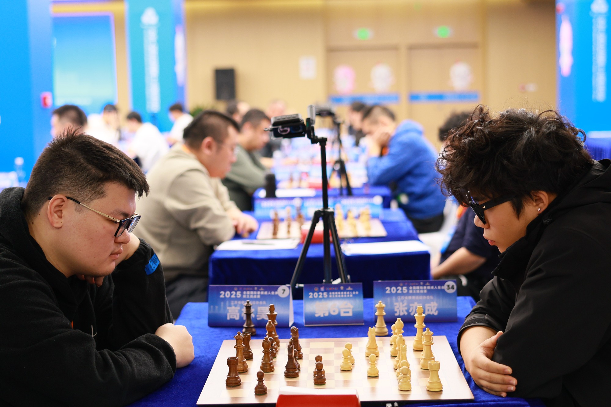 赵爱国、詹辉、王继、叶江川、曾立新、刘适兰分别为三台棋局开棋。一子落定,全局皆活,象征比赛正式拉开帷幕。棋手们迅速投入激烈的对弈中。在接下来的赛程中,他们将在64格棋盘上运筹帷幄,以棋会友,不仅竞技棋艺,更传递着智慧、风度与热爱。