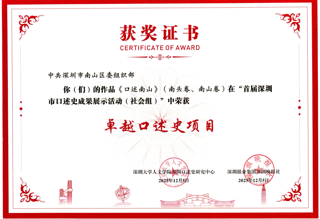 近日,《口述南山》(南头卷·南山卷)荣获首届深圳市口述史成果展示活动“卓越口述史项目”。