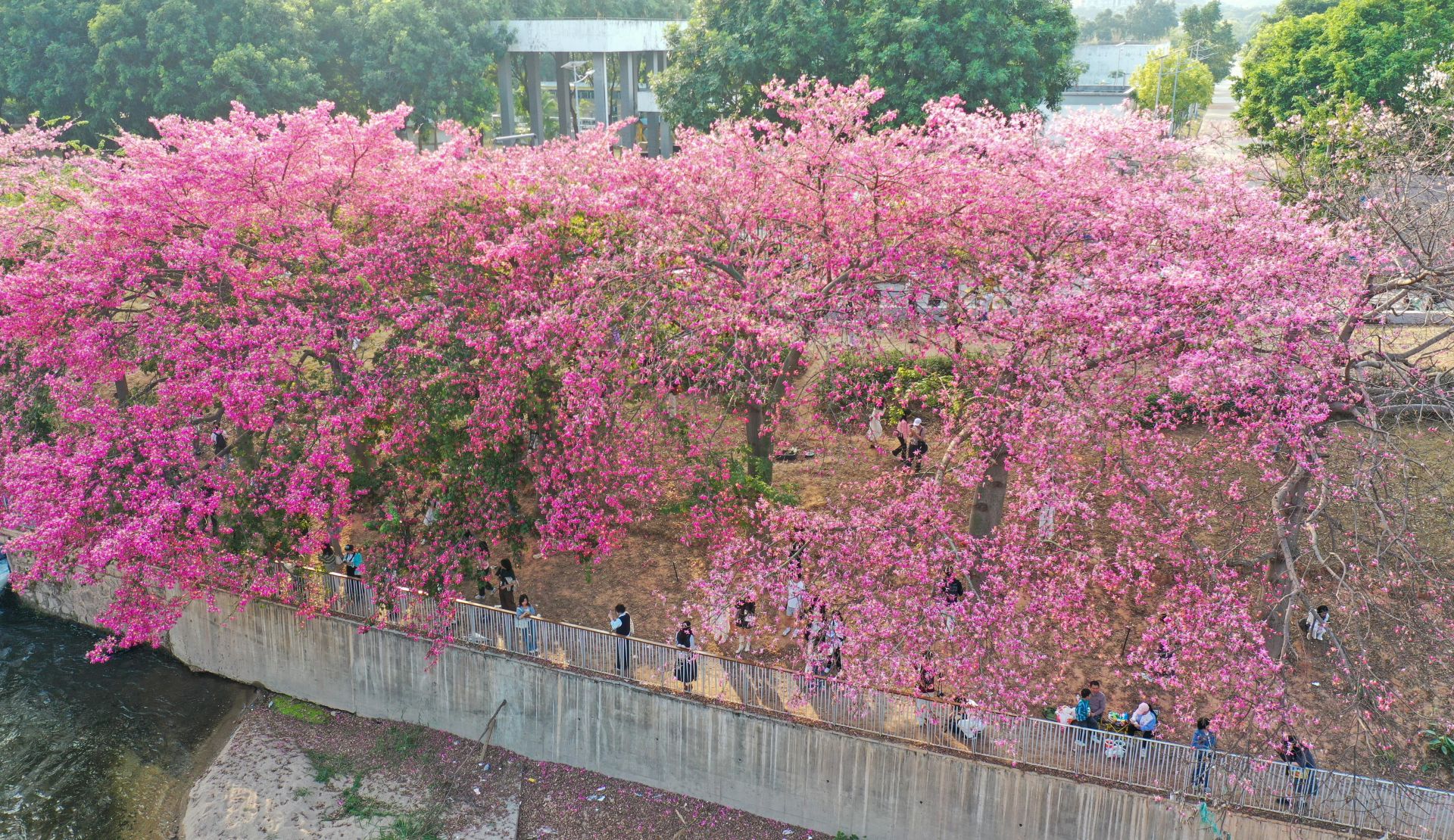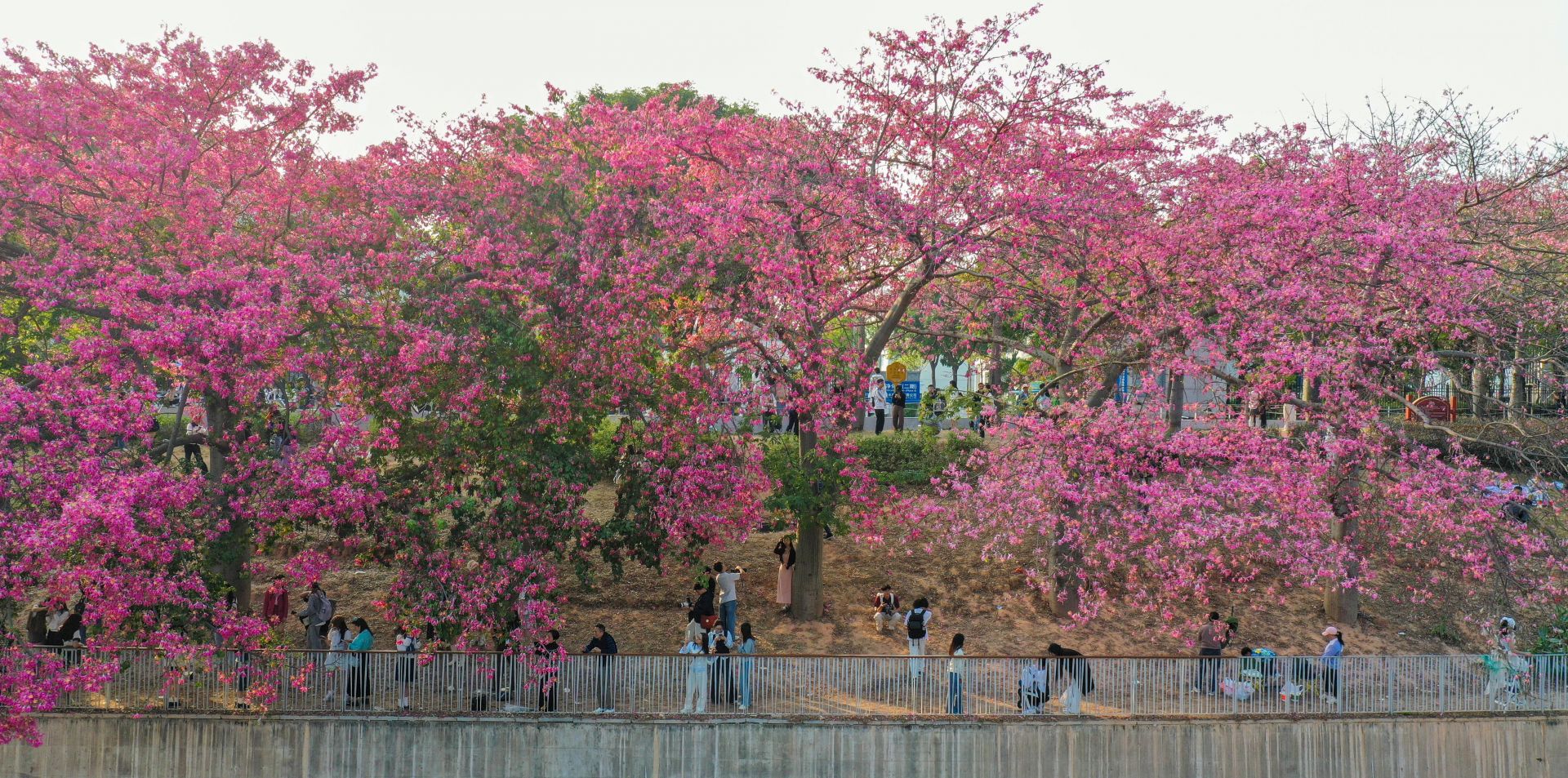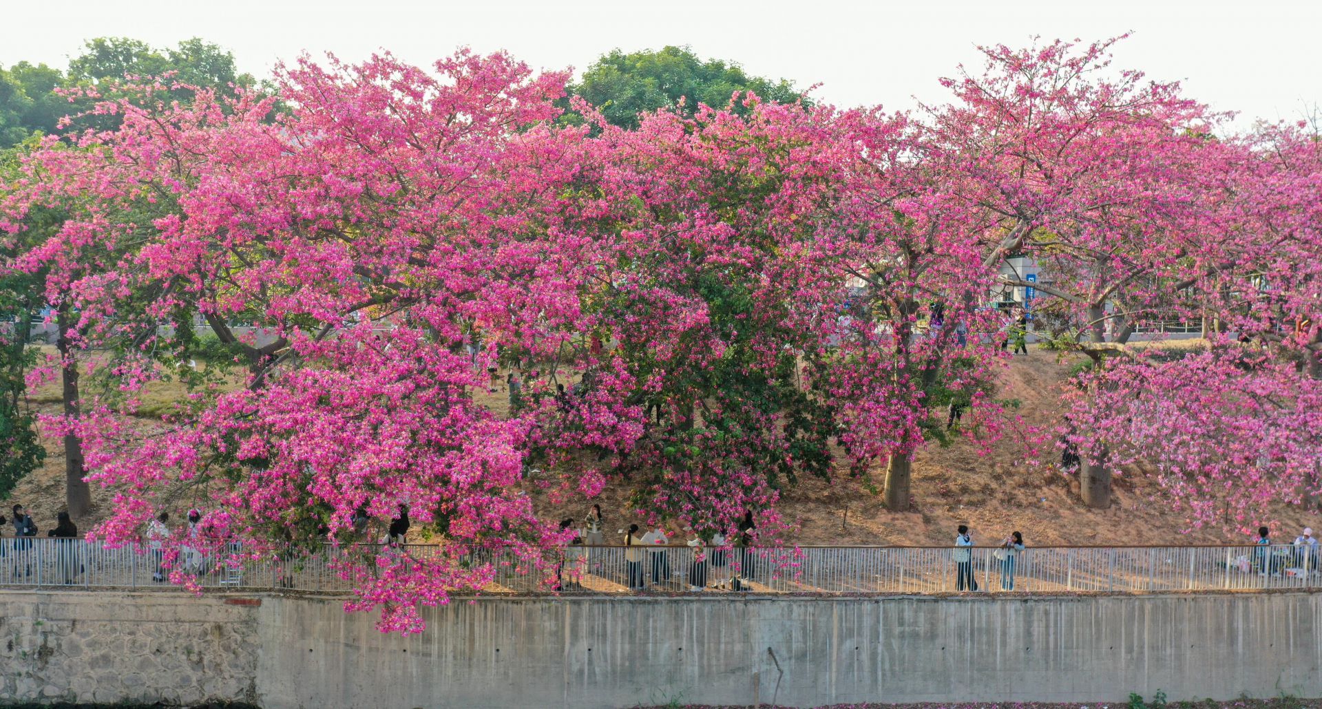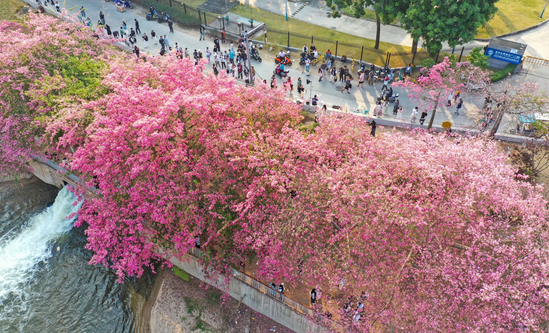 近日,深圳龙华观澜河畔,绵延成片的异木棉绚烂盛放。一树树粉黛如霞,与碧水晴空相映,将城市滨水廊道装点成梦幻花廊。市民漫步其间,驻足留影,笑语与花影交织。