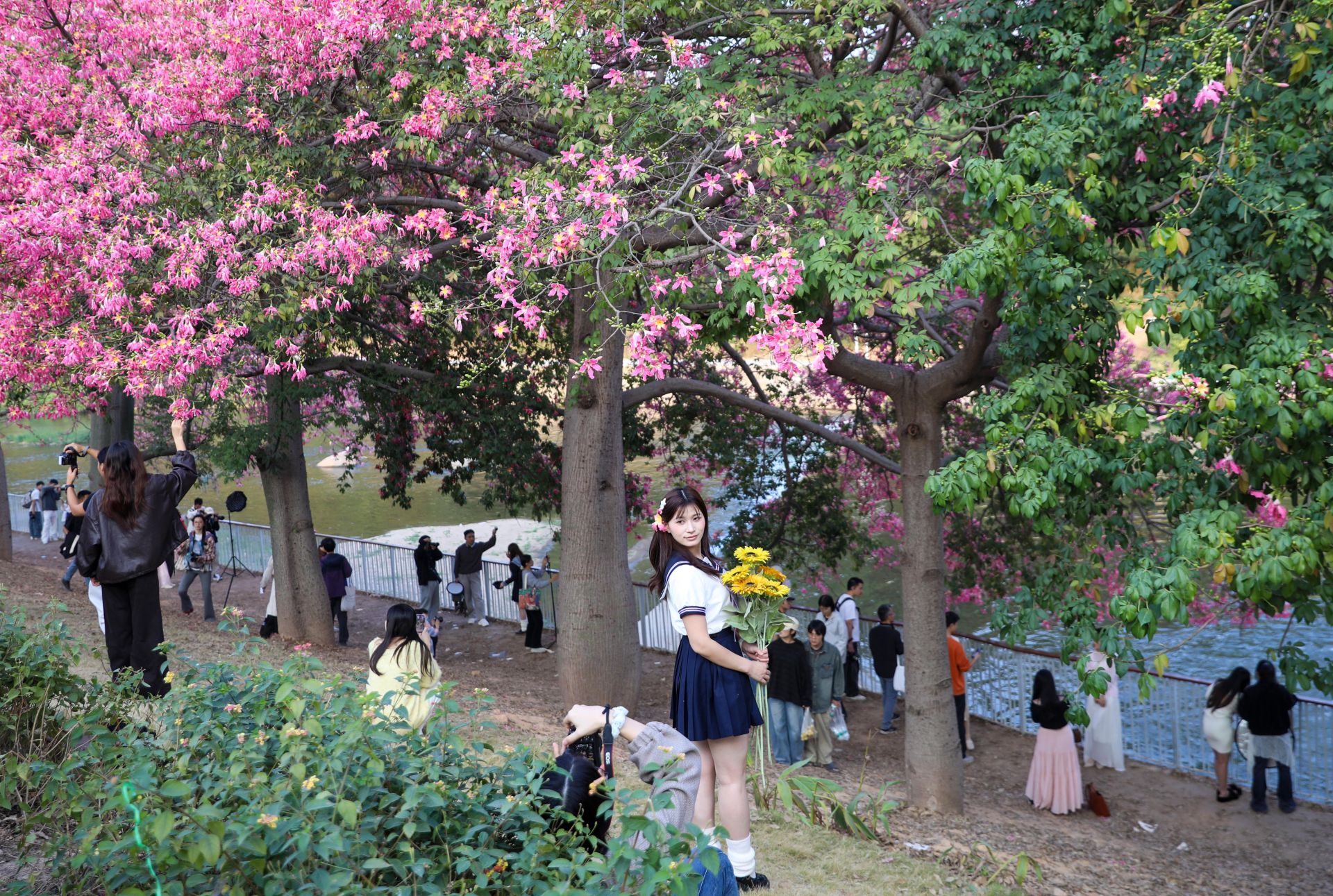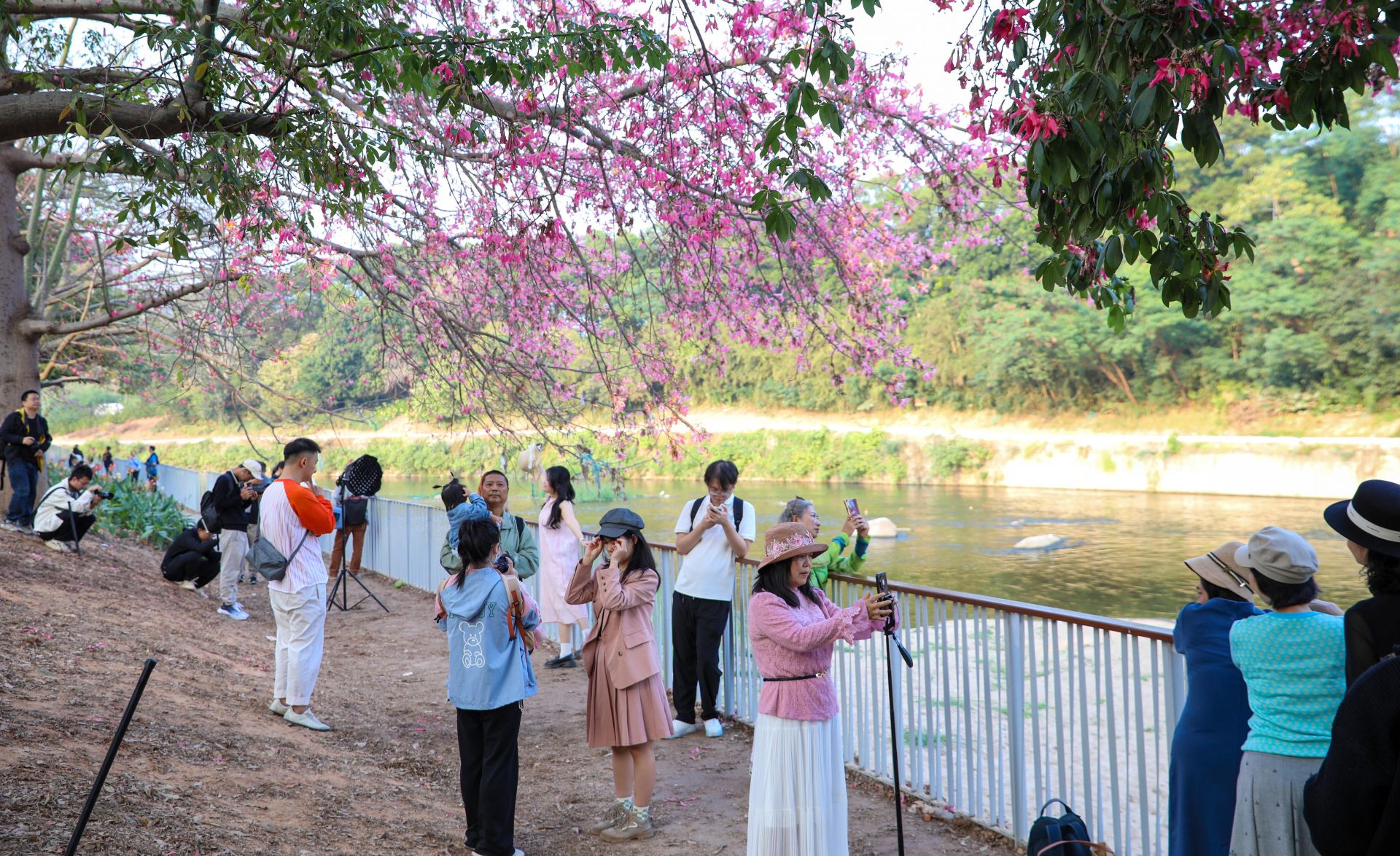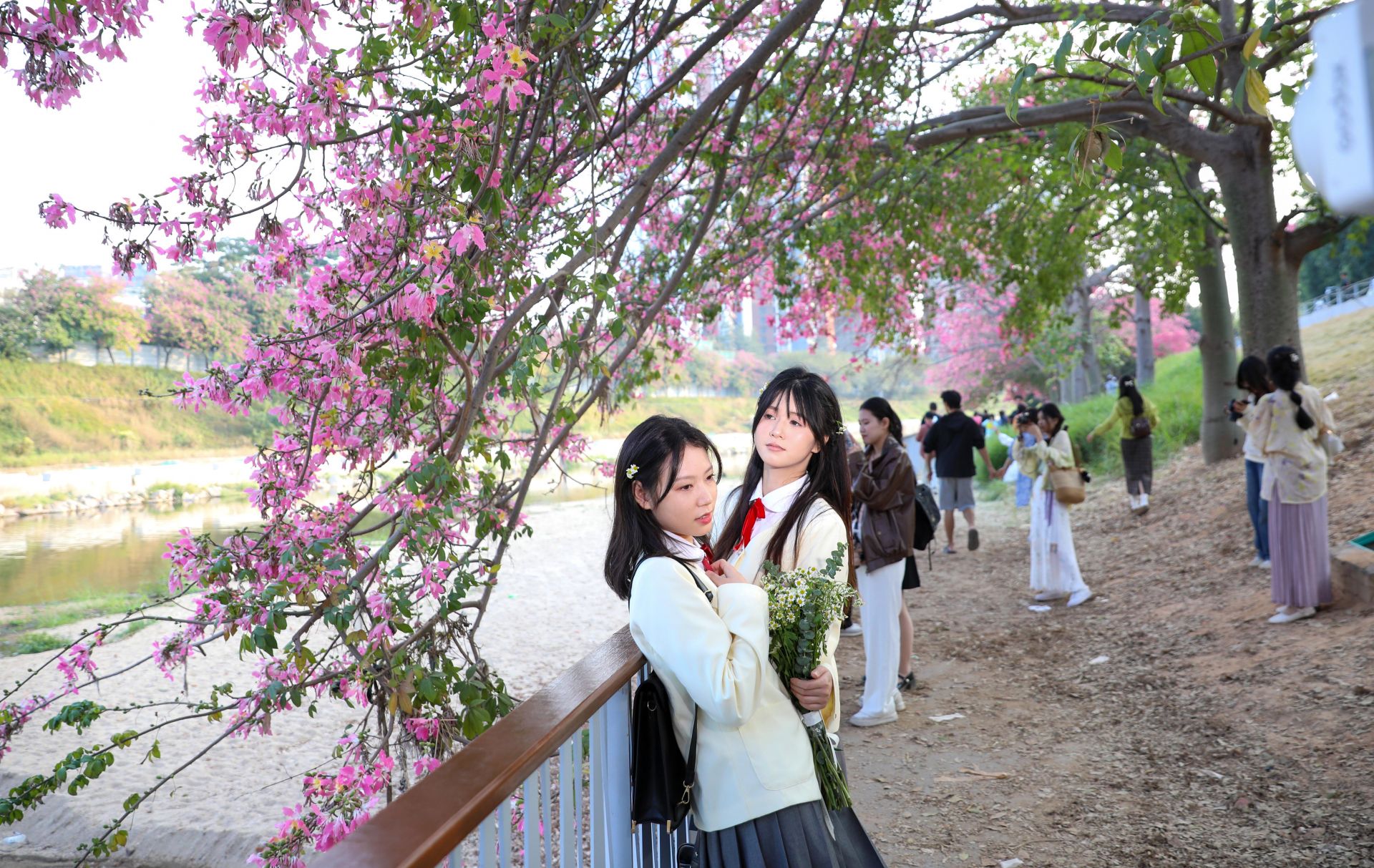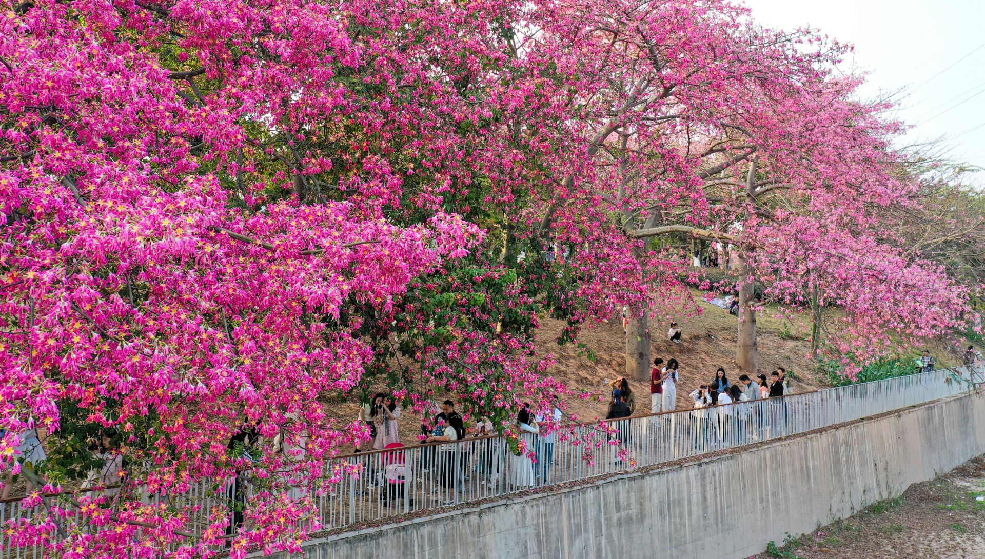近日,深圳龙华观澜河畔,绵延成片的异木棉绚烂盛放。一树树粉黛如霞,与碧水晴空相映,将城市滨水廊道装点成梦幻花廊。市民漫步其间,驻足留影,笑语与花影交织。