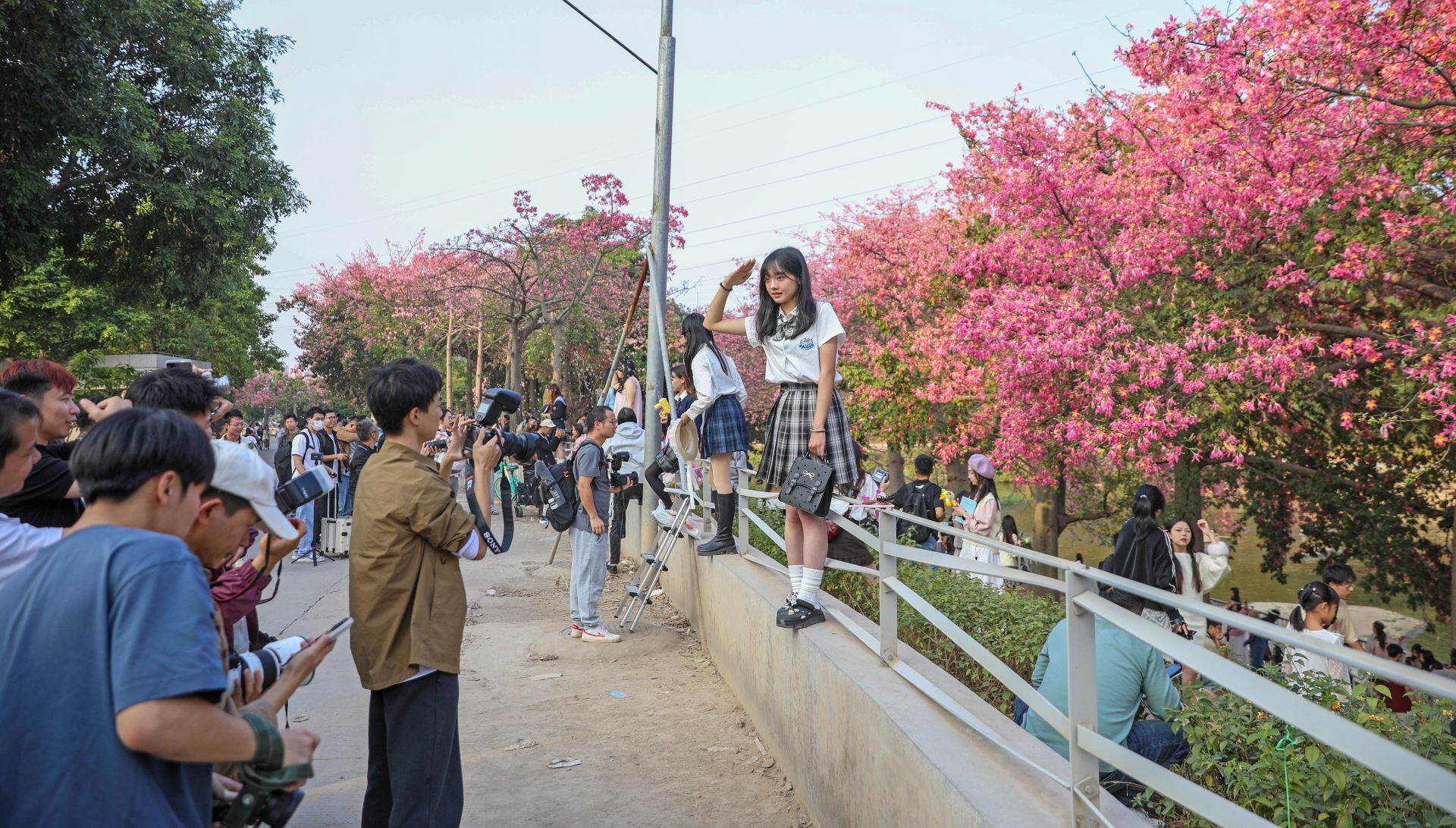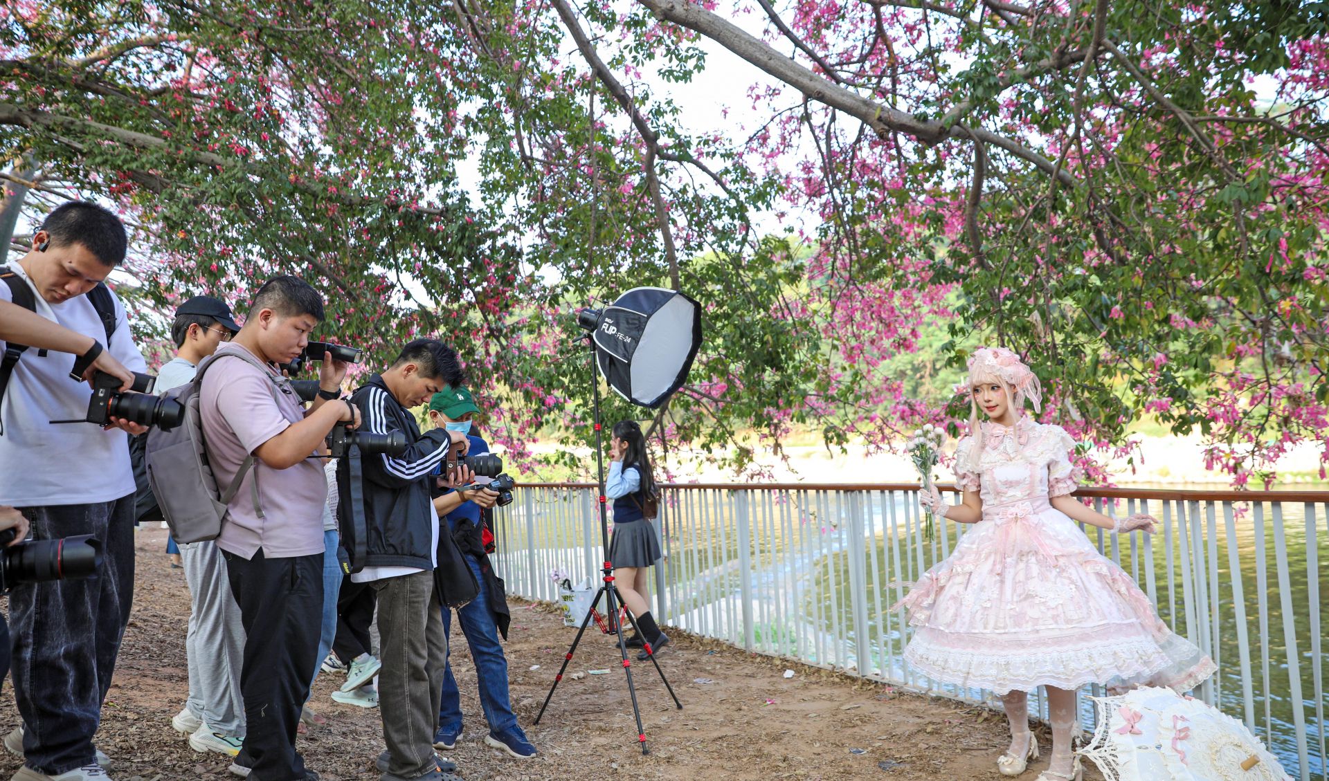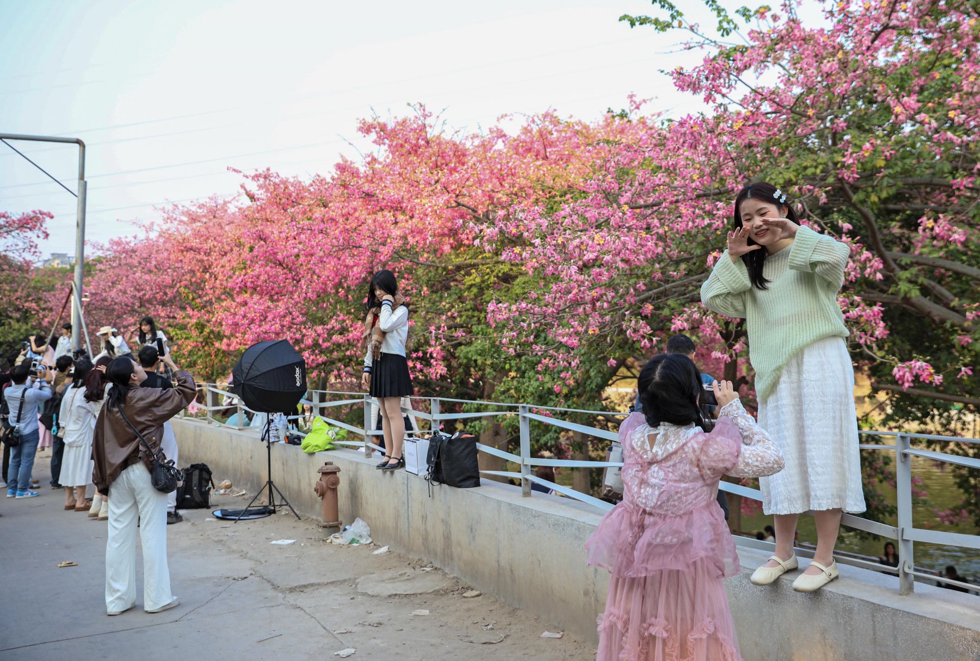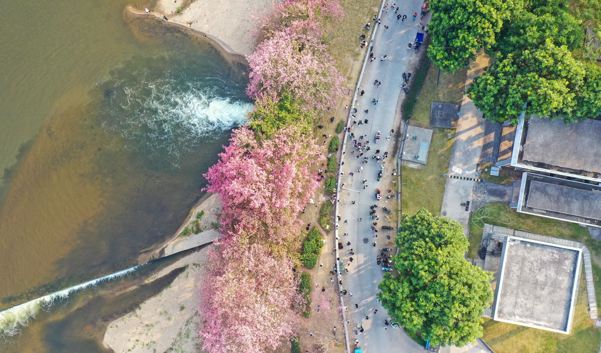 近日,深圳龙华观澜河畔,绵延成片的异木棉绚烂盛放。一树树粉黛如霞,与碧水晴空相映,将城市滨水廊道装点成梦幻花廊。市民漫步其间,驻足留影,笑语与花影交织。