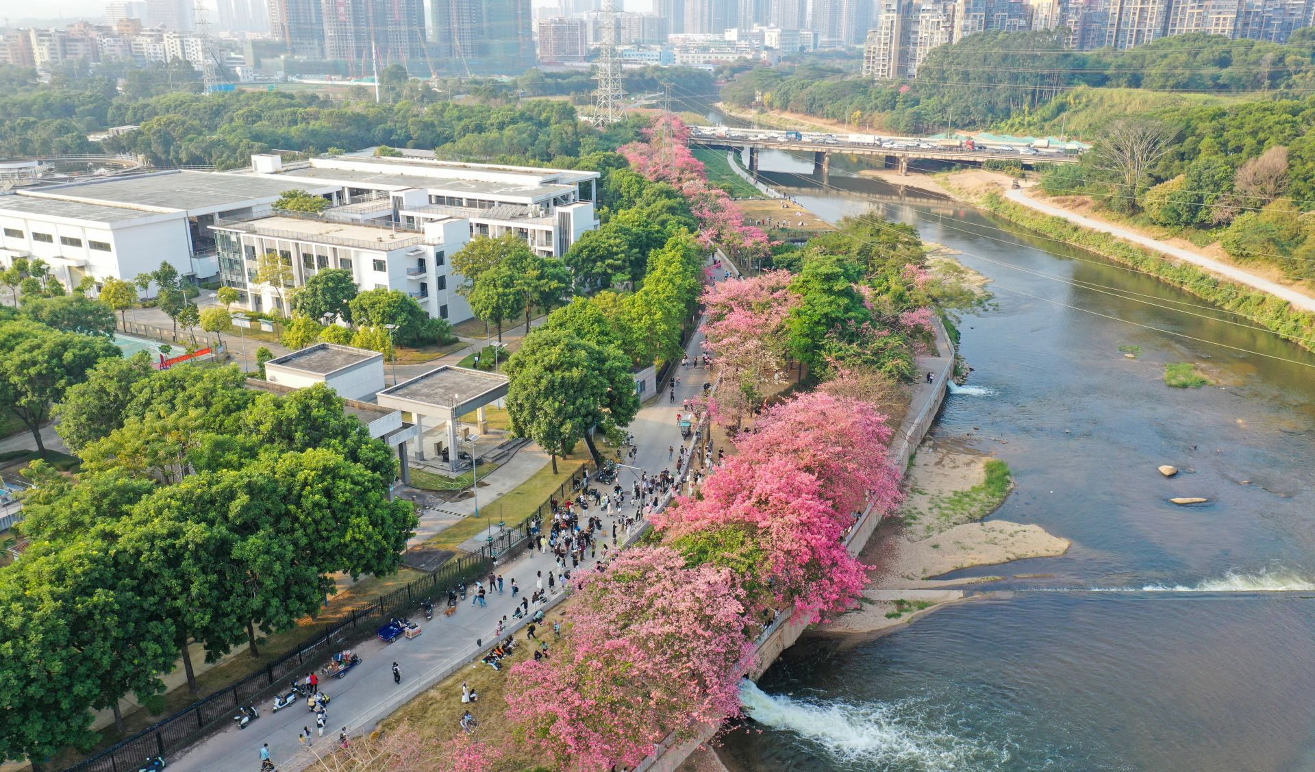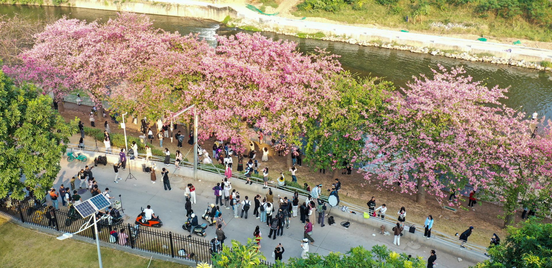 花开是景,人游成画。这片沿着河岸铺展的浪漫,不仅点亮了河岸线,也诠释着深圳四季常青、街巷飞花的城市诗意。