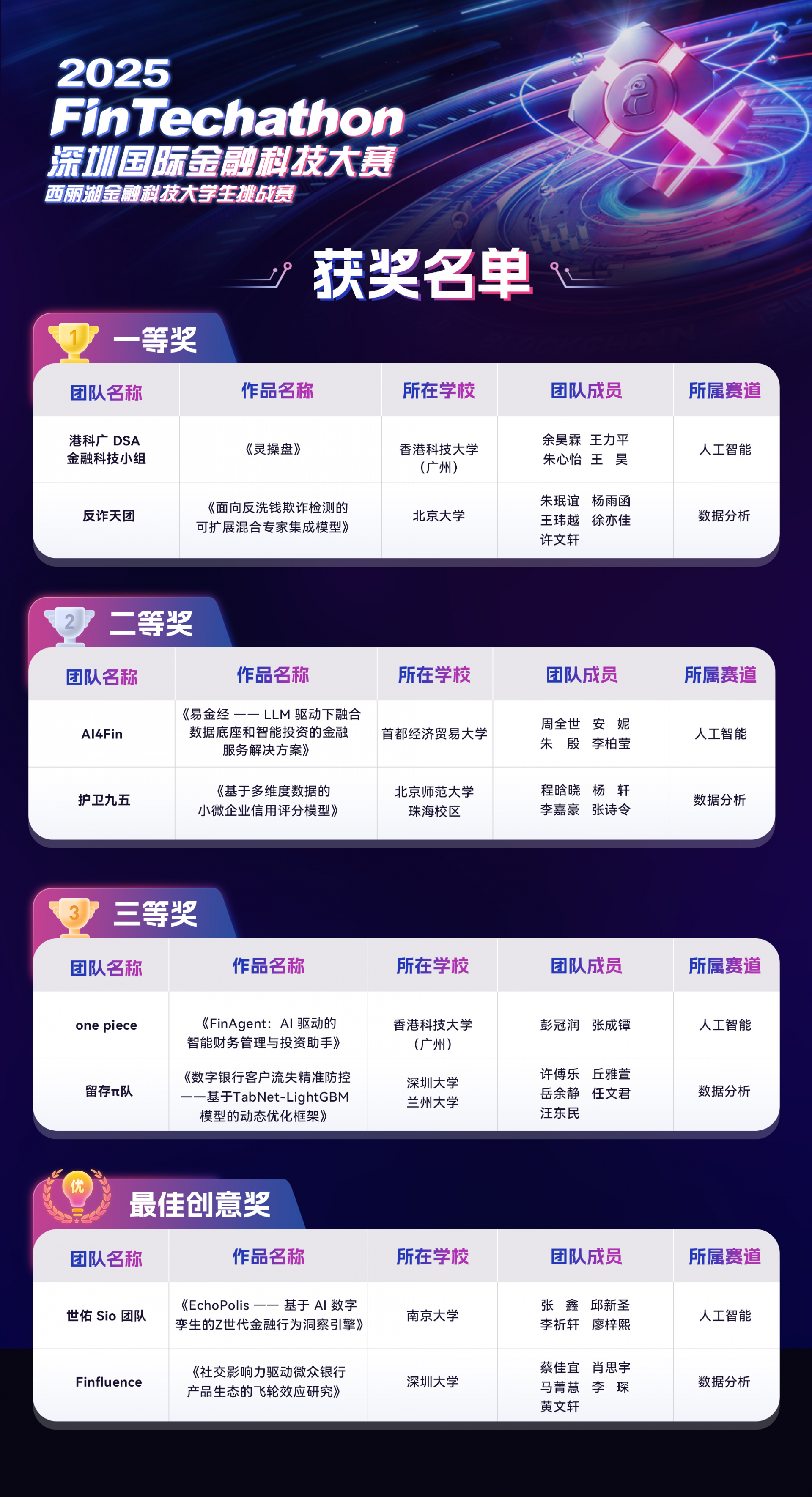 12月5日-7日,由深圳市地方金融管理局进行战略指导,深大微众金融科技学院、微众银行、InfoQ 极客传媒、狗熊会等多方联合举办的2025 FinTechathon深圳国际金融科技大赛——西丽湖金融科技大学生挑战赛(以下简称“大赛”)在深圳圆满收官。大赛吸引了来自270所高校的372支队伍、1709名学子同台竞技,最终有来自全国的8支队伍获奖。