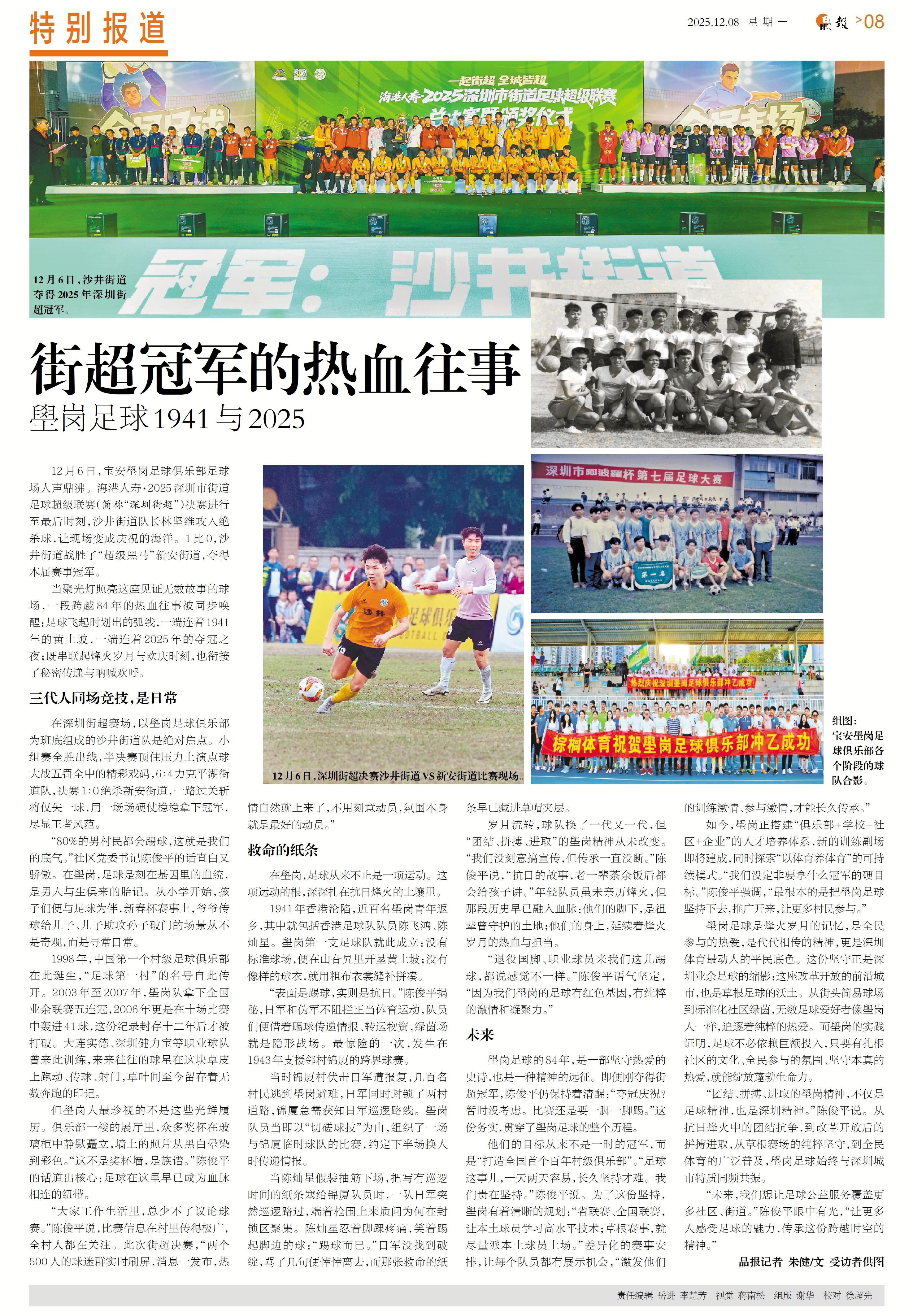 “团结、拼搏、进取的壆岗精神,不仅是足球精神,也是深圳精神。”陈俊平说。从抗日烽火中的团结抗争,到改革开放后的拼搏进取,从草根赛场的纯粹坚守,到全民体育的广泛普及,壆岗足球始终与深圳城市特质同频共振。