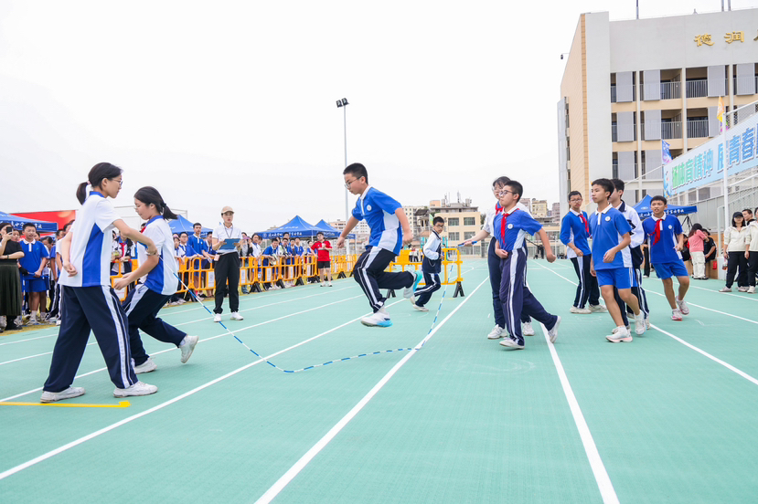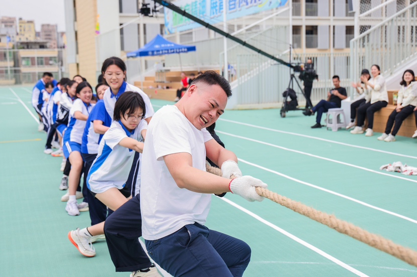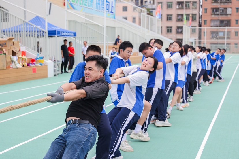 趣味赛场同样热闹非凡,洋溢着欢乐氛围。长绳翻飞之间,同学们默契配合、灵活穿梭,身影轻盈如燕;拔河赛场之上,师生紧握长绳、奋力后仰,紧绷的绳线间传递着团结的力量,温暖了整个赛场。