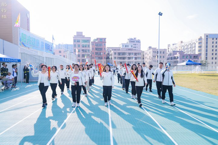 开幕式上,醒狮鼓点铿锵,国旗校徽引路,各年级方阵与教师方阵依次亮相,创意表演与健美操展示尽显青春激情与活力。