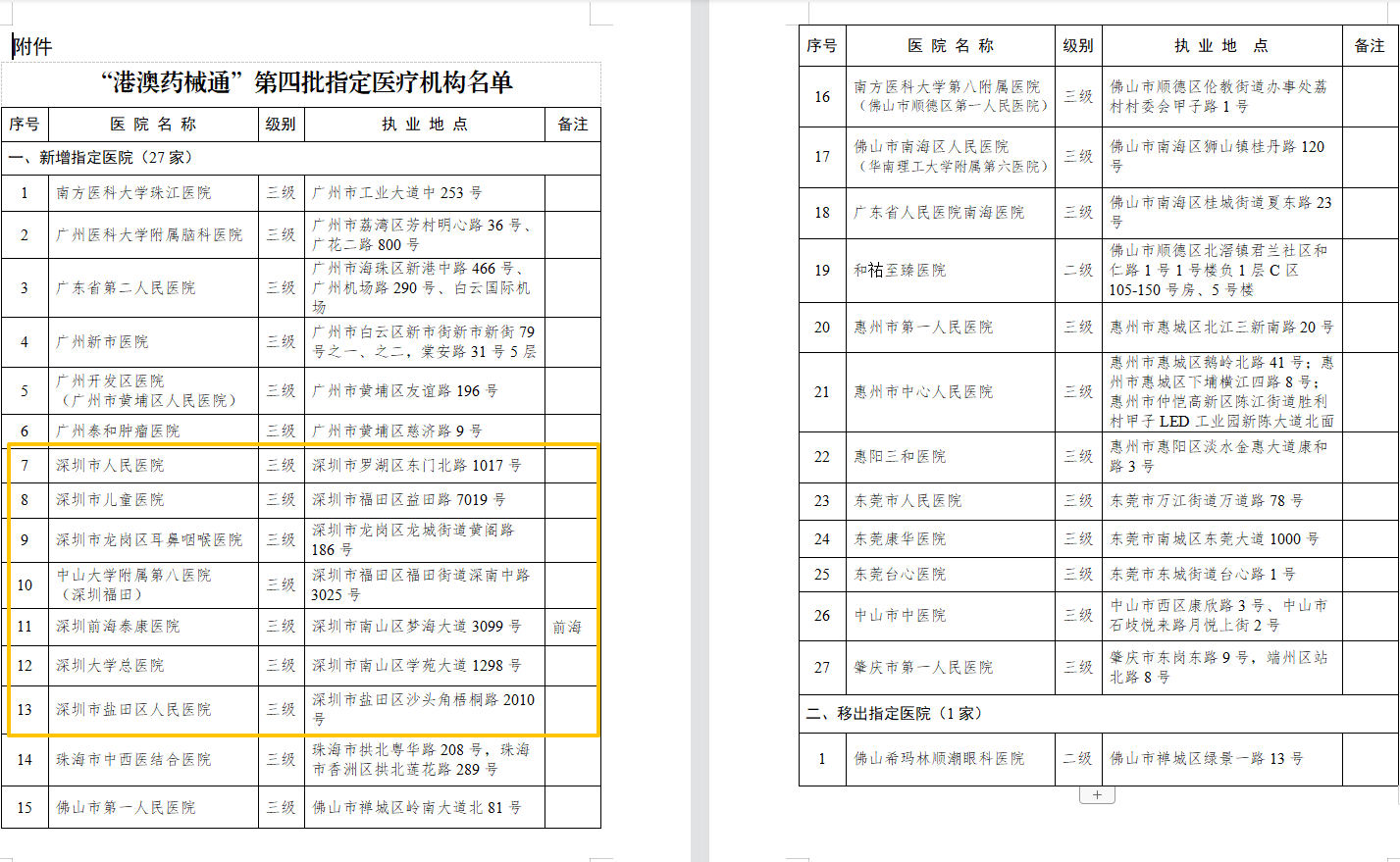 日前,省卫健委、省药品监督管理局联合发布《关于印发粤港澳大湾区“港澳药械通”第四批指定医疗机构名单的通知》(以下简称《通知》)。