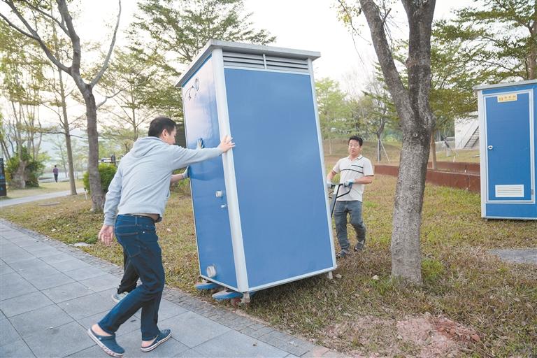 ▲工作人员在九围生态库(九围湿地公园)搬运、安装临时公厕。