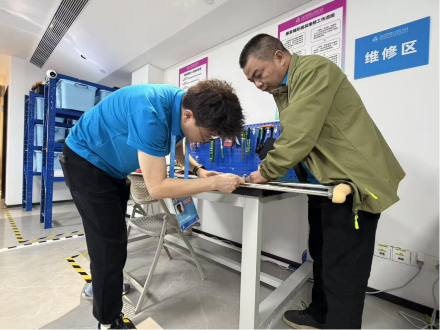 “辅具保障可以说很‘硬核’,我们准备了两站两车三柜,也就是在场馆各建设一个站点,并配备一辆车,同时在运动员和技术官员入住的酒店配备爱心柜。”爱心服务柜的设置更是尽显暖心细节。柜内不仅配备了各类可供借用的辅具,还贴心地准备了笔记本、笔、针线包、雨伞等生活用品和学习用品,能够全方位满足运动员的多样化需求。“我们的工作很平凡,没有什么惊天动地的大事,都是换螺丝、打气、修拐杖这类小事,但对于运动员而言,这些小事却会影响他们的比赛状态和参赛体验。”张涛用一个形象的比喻阐释了工作的意义:“就好比跑鞋里的一粒沙子,看似微不足道,却能让人极为难受,我们的职责就是帮运动员倒掉这粒沙,让他们能够毫无后顾之忧地向着梦想冲刺。”