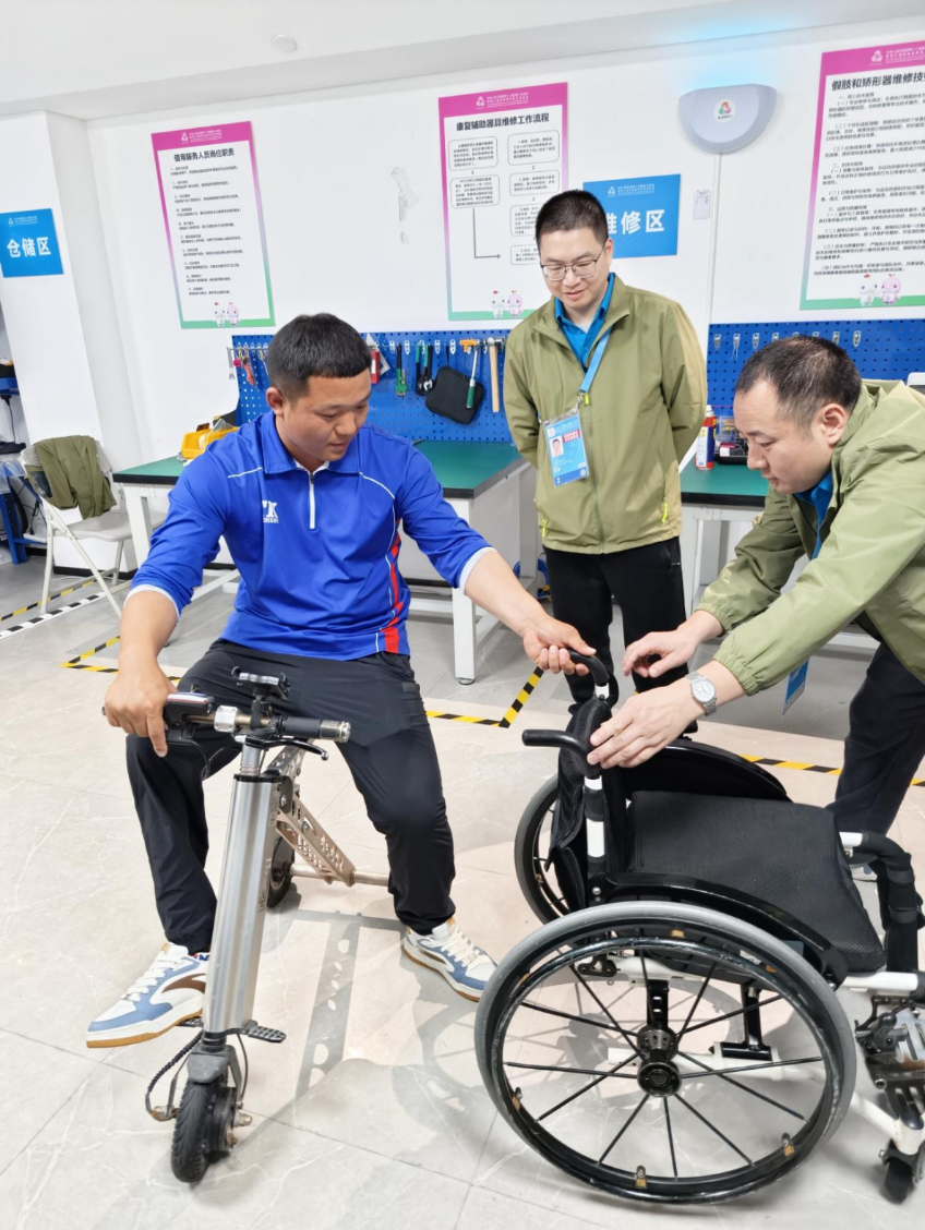 赛事期间,竞技类辅具的维修曾给团队带来不小挑战。“这类辅具日常接触少,配件需求特殊,第一天就遇到了运动轮椅辅助轮螺母滑丝的情况。”张涛回忆,团队迅速联动市级保障中心,在运动员要求的时限内完成维修,及时化解危机。针对羽毛球比赛中运动员频繁需要给轮椅轮胎打气的需求,团队果断优化流程,将打气筒直接配备在检录处和训练场,省去填表签字的繁琐环节,让服务更高效便捷。