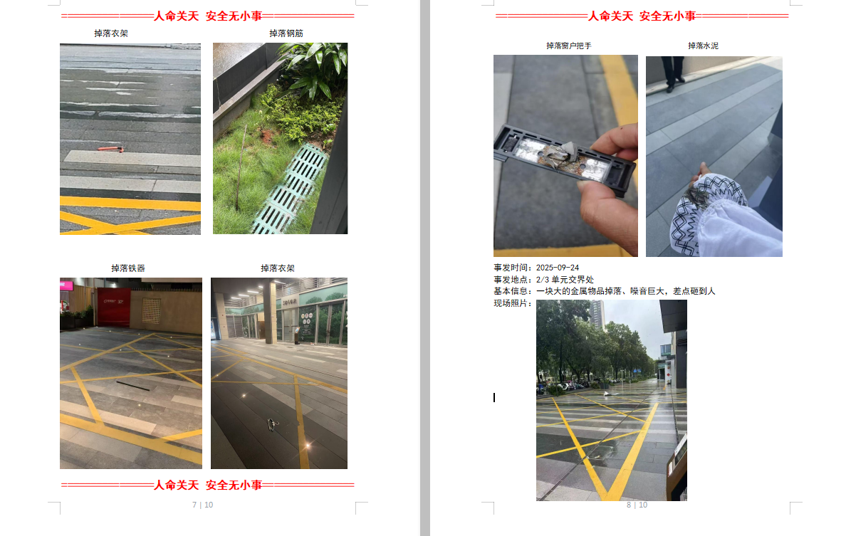 星河开市客环球商业中心(二期)小区自2025年2月入住以来,先后发生水泥块、扳手、宠物猫等物品高空坠落事件,让居民整日提心吊胆。高空坠物如“悬顶之剑”,一旦命中便可能夺人性命,消除风险刻不容缓,急需“极速方案”落地。