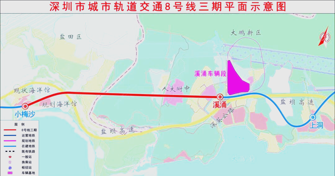 8号线三期起始于盐田区8号线二期小梅沙站,止于大鹏新区溪涌站,全长约3.7公里。共设站1个,溪涌站。