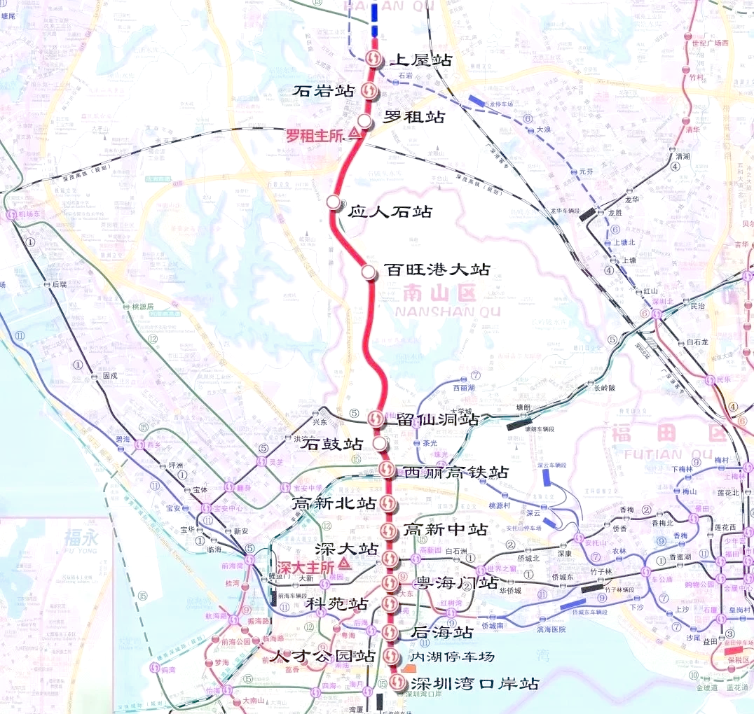 13号线一期贯通后,可实现与1号线、2号线、5号线、6号线、9号线、11号线等线路换乘,将有利于缓解中西部地区南北向交通压力,提升市民出行效率,助力城市高质量发展和深港两地及大湾区互联互通。