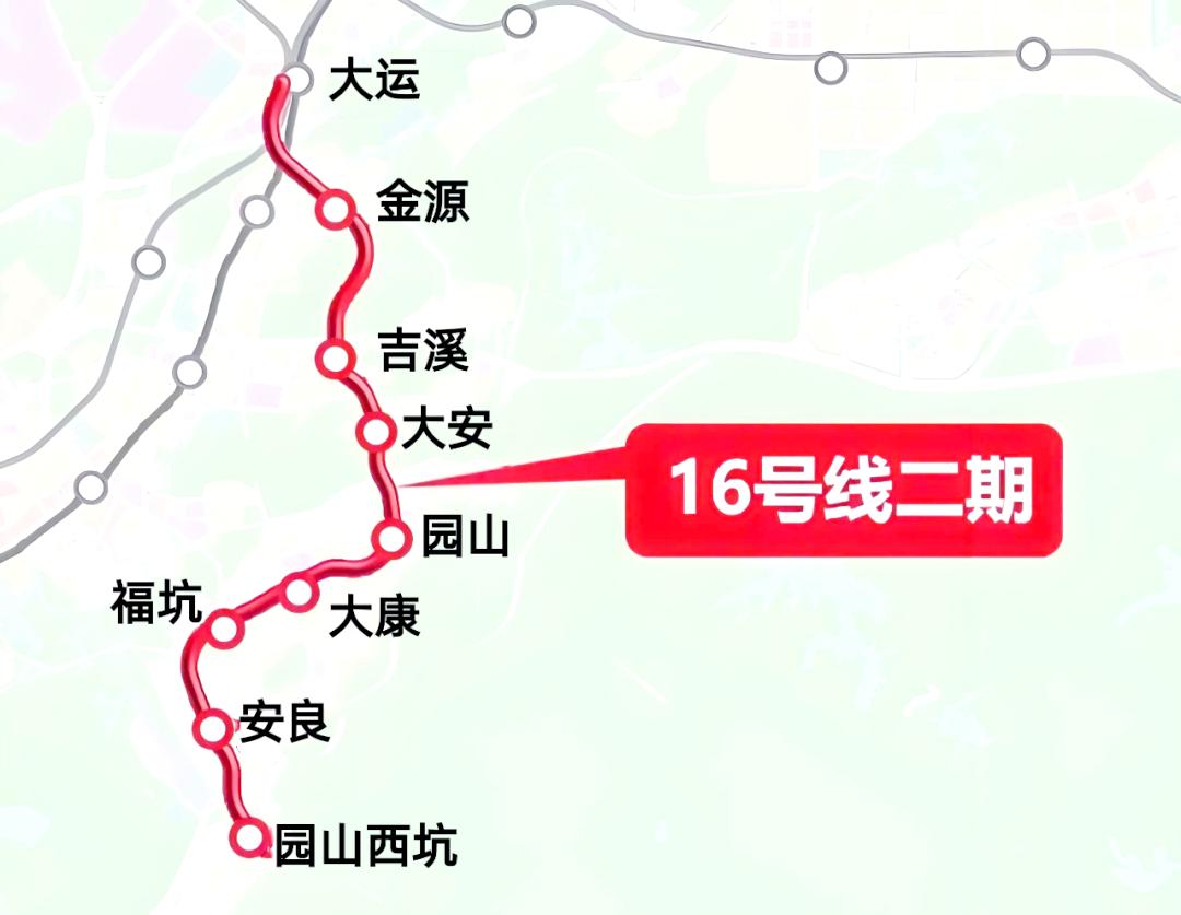 新开通的地铁16号线二期起自既有大运站,终至园山西坑站,线路全长约9.54公里,设车站8座。线路贯穿龙岗园山街道,串联西坑、大康、安良等社区,实现“村村通”。