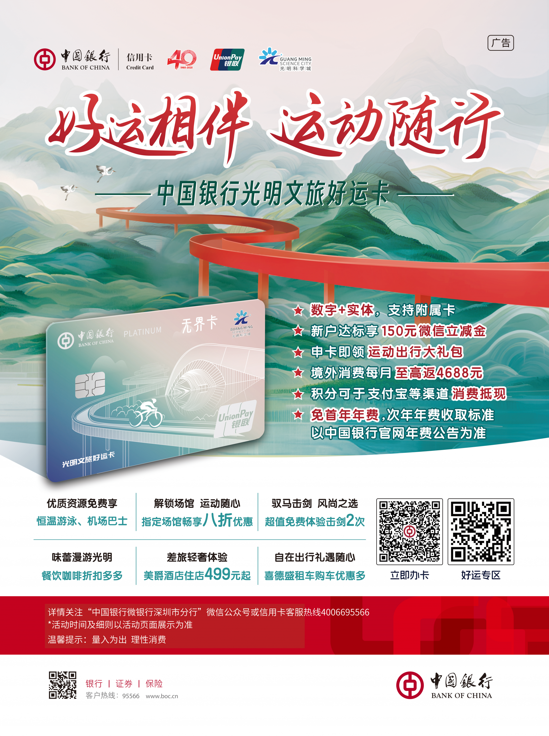 一卡畅享五场景。“光明文旅好运卡”系政银企商深度融合的创新性成果。此卡立足于区域文旅产业的发展特征以及市民的消费需求,通过深度整合资源打造而成,不仅具备中国银行信用卡的基础金融服务功能,还为持卡人量身定制了多项文旅专属权益,覆盖运动、餐饮、出行、玩乐、住宿等五大场景,实现“一卡畅享光明文旅”的目标,旨在全方位助力光明区促进消费,切实增强市民消费的便捷性与获得感。