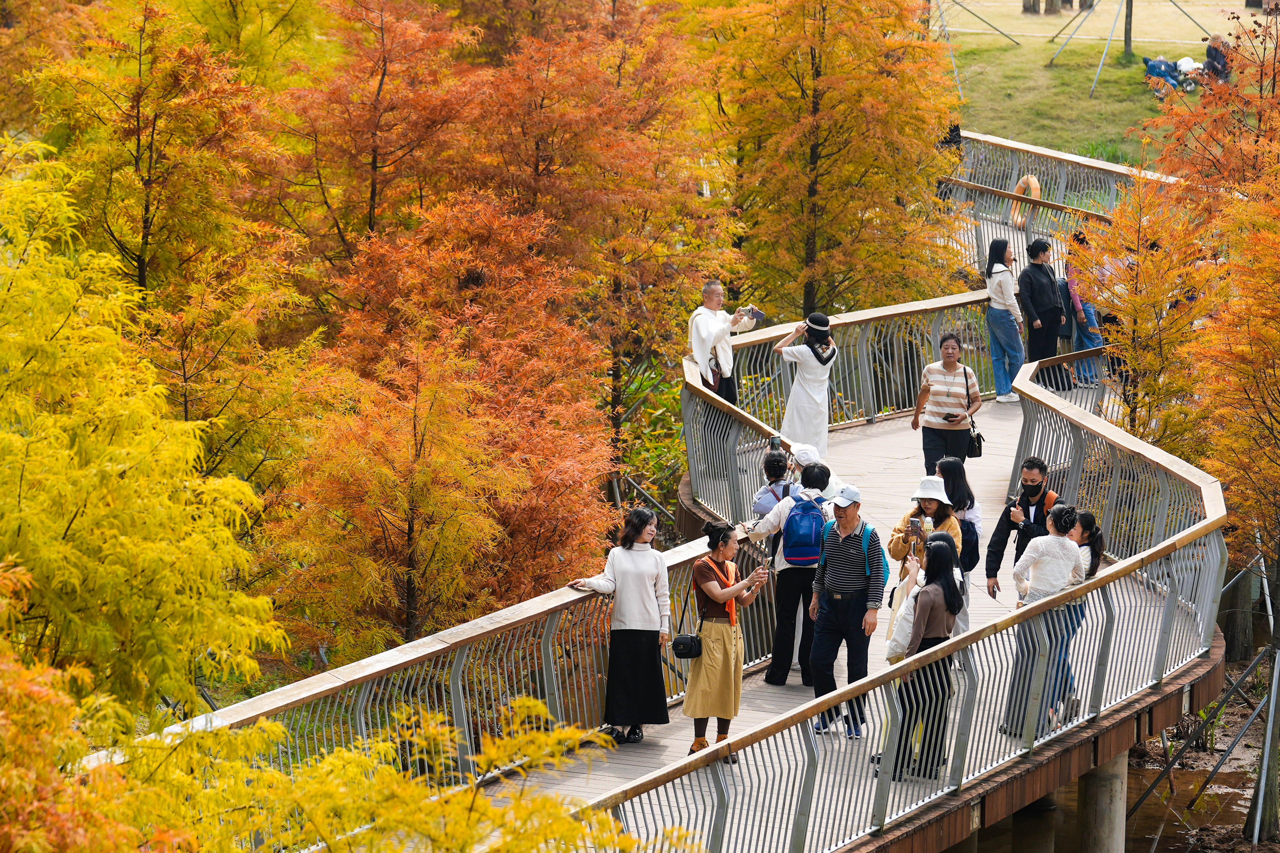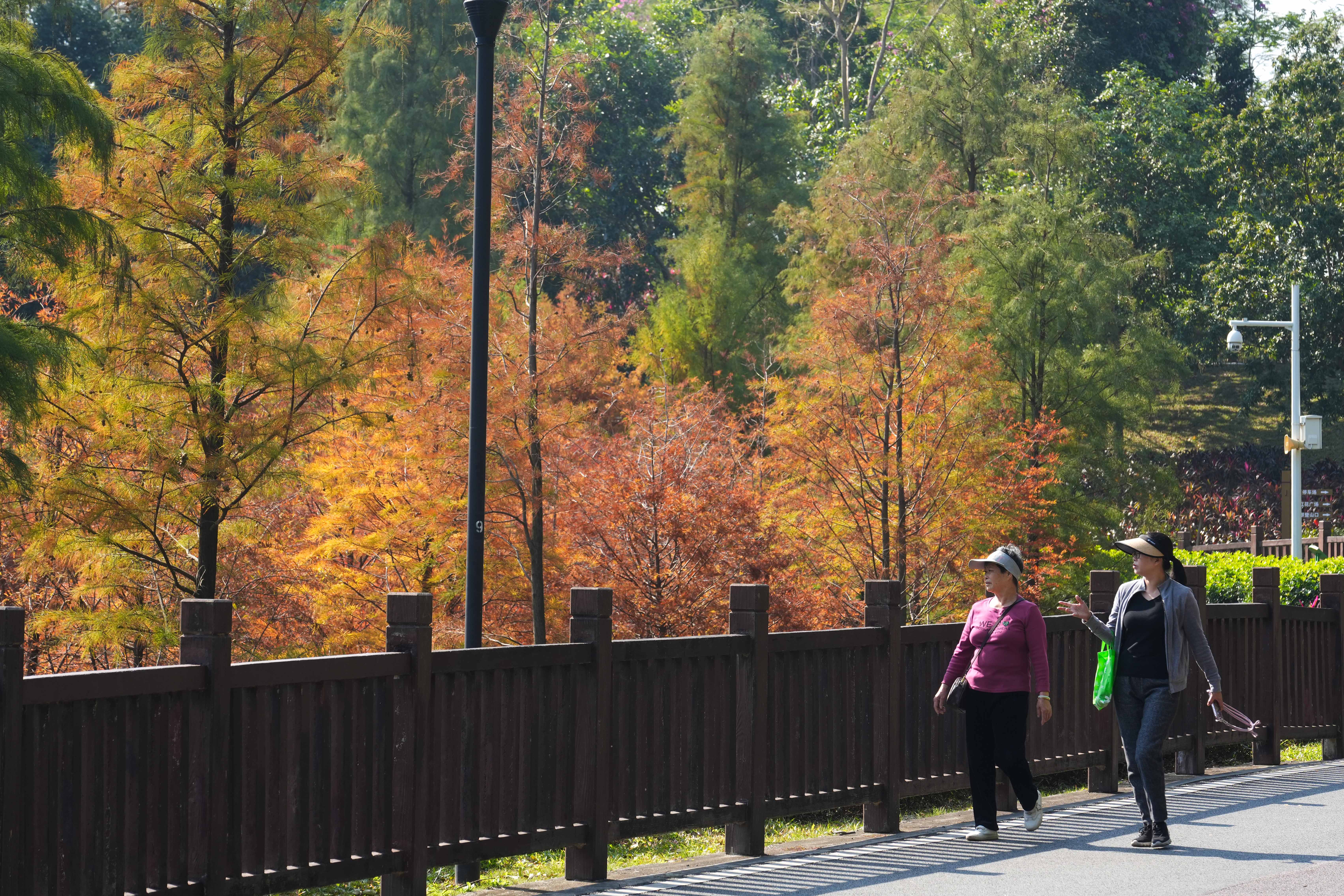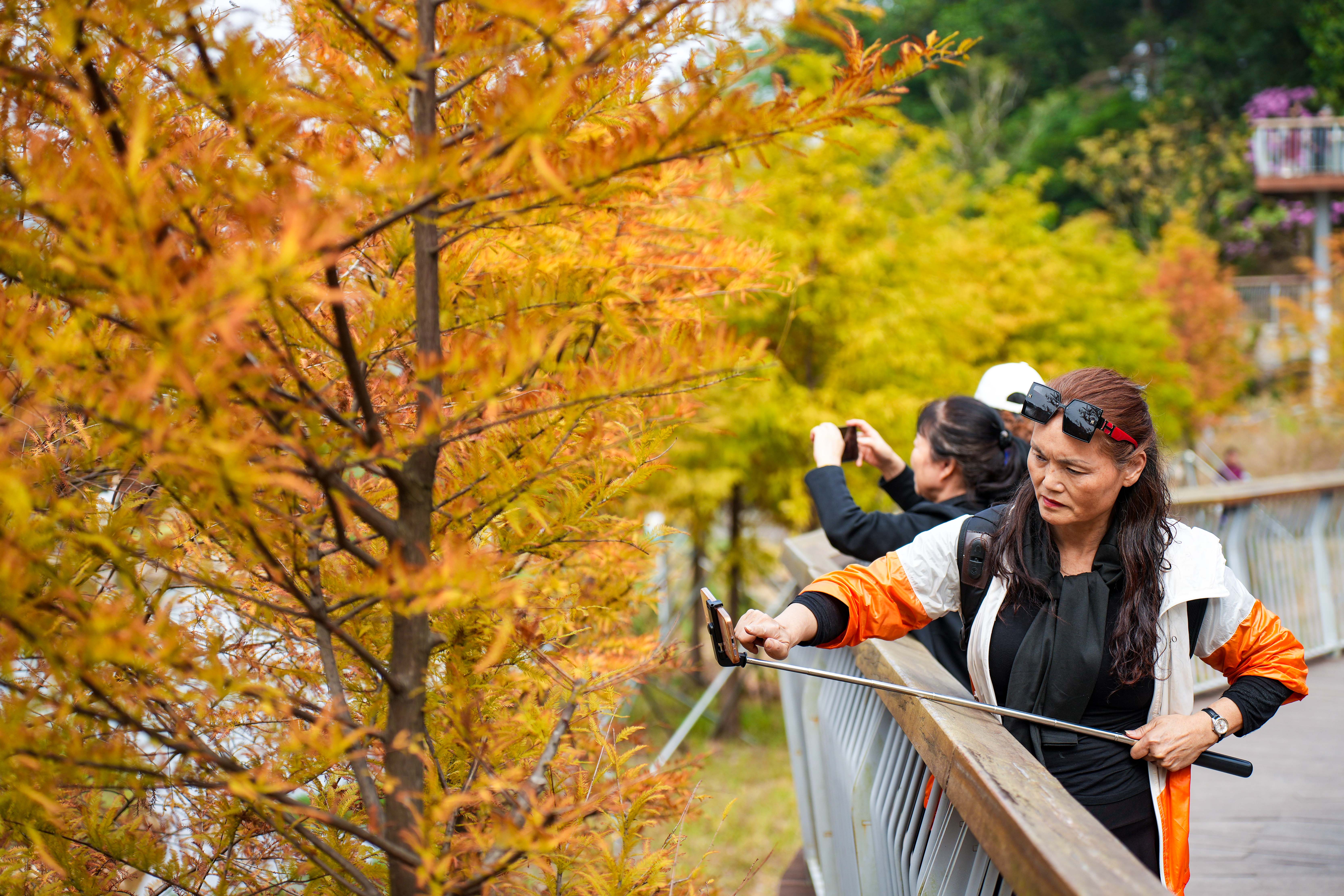 在龙岗区红花岭低碳环境生态园,蜿蜒的空中步道被橙黄交织的落羽杉环绕,步道上聚集着不少赏秋市民。有人举着手机定格彩林景致,有人倚着护栏眺望秋景,远处草坪上还能看到家庭野餐的身影,让这片低碳生态空间成了秋日里的人气打卡地。
