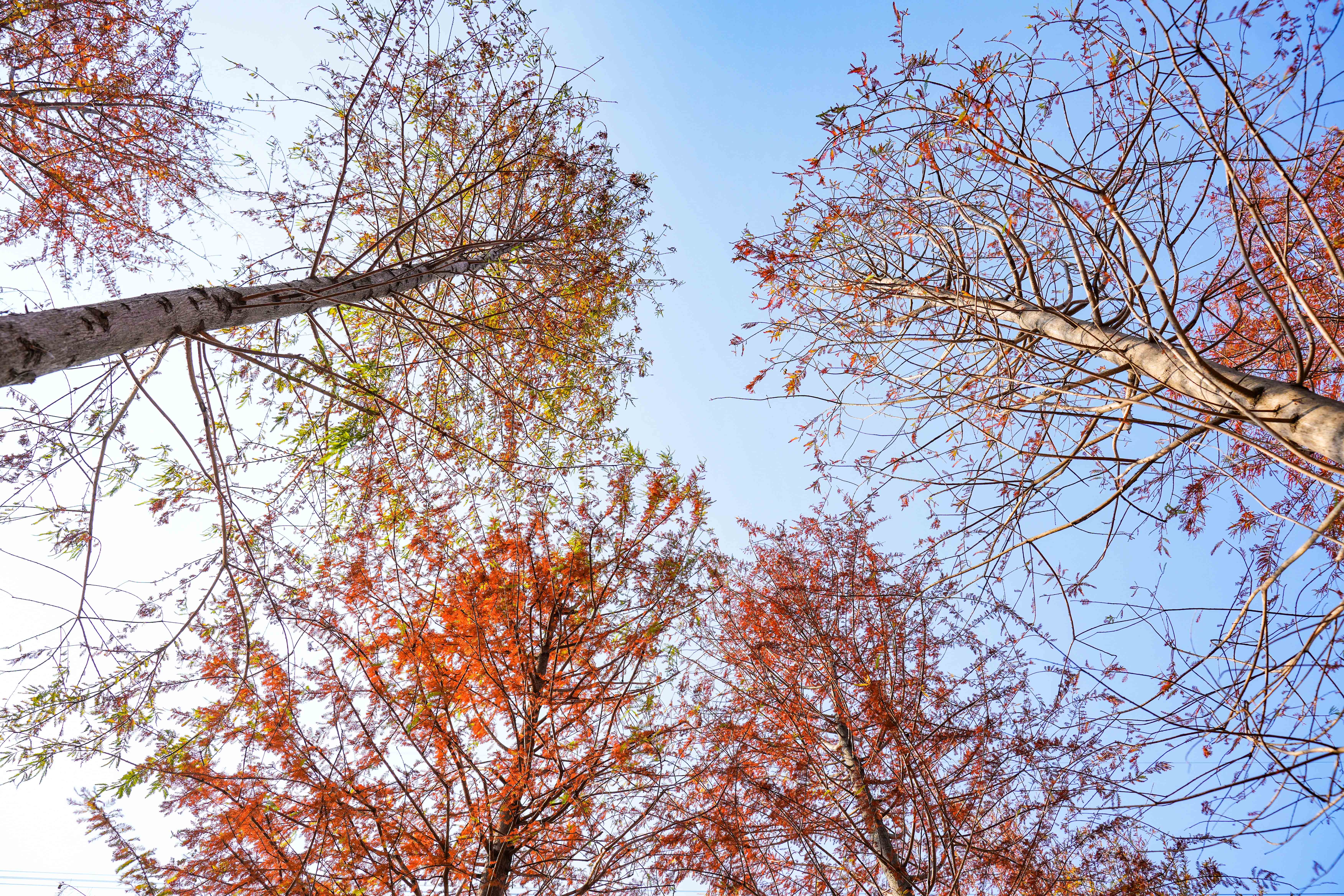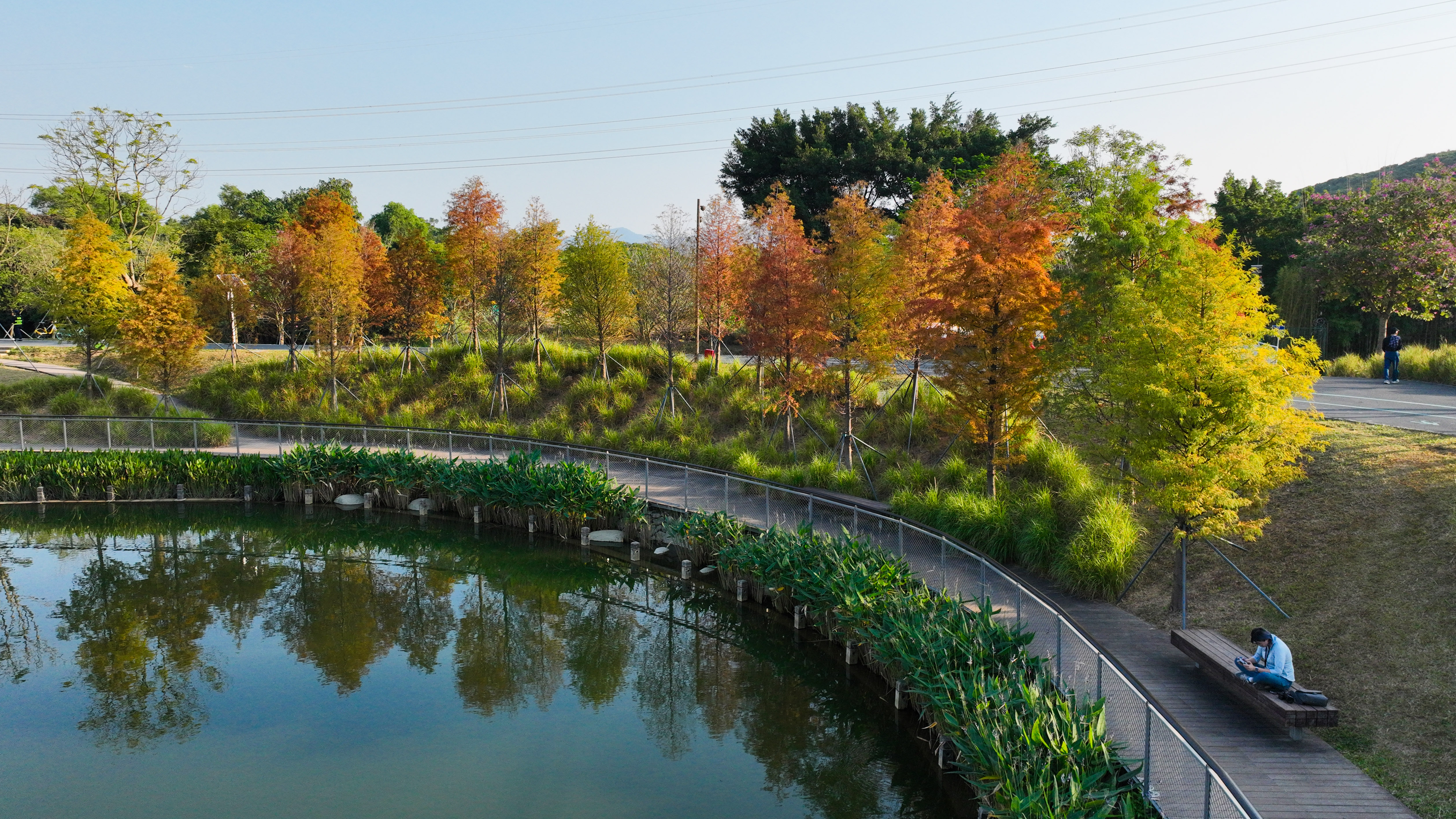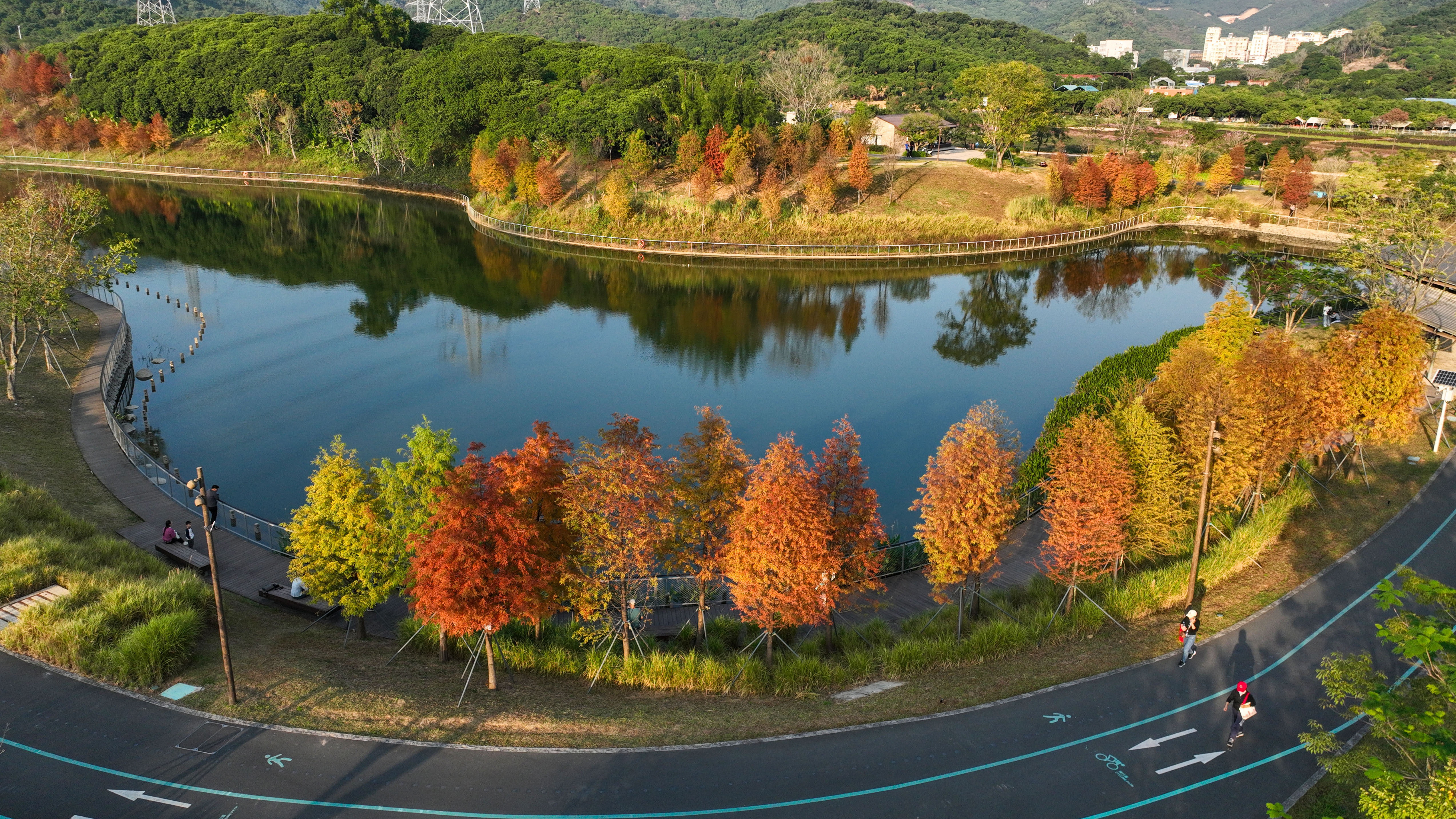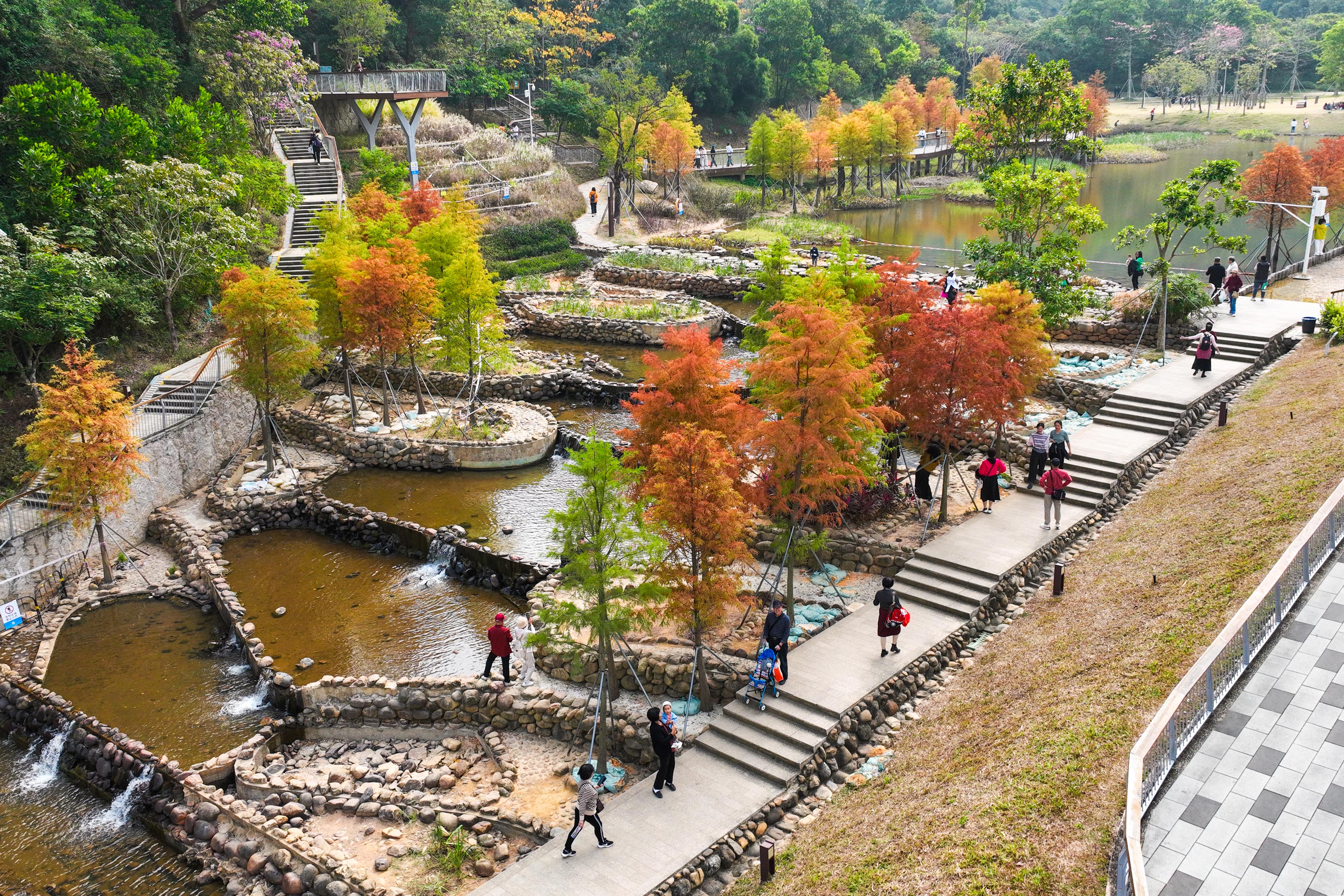 在龙岗区红花岭低碳环境生态园,蜿蜒的空中步道被橙黄交织的落羽杉环绕,步道上聚集着不少赏秋市民。有人举着手机定格彩林景致,有人倚着护栏眺望秋景,远处草坪上还能看到家庭野餐的身影,让这片低碳生态空间成了秋日里的人气打卡地。