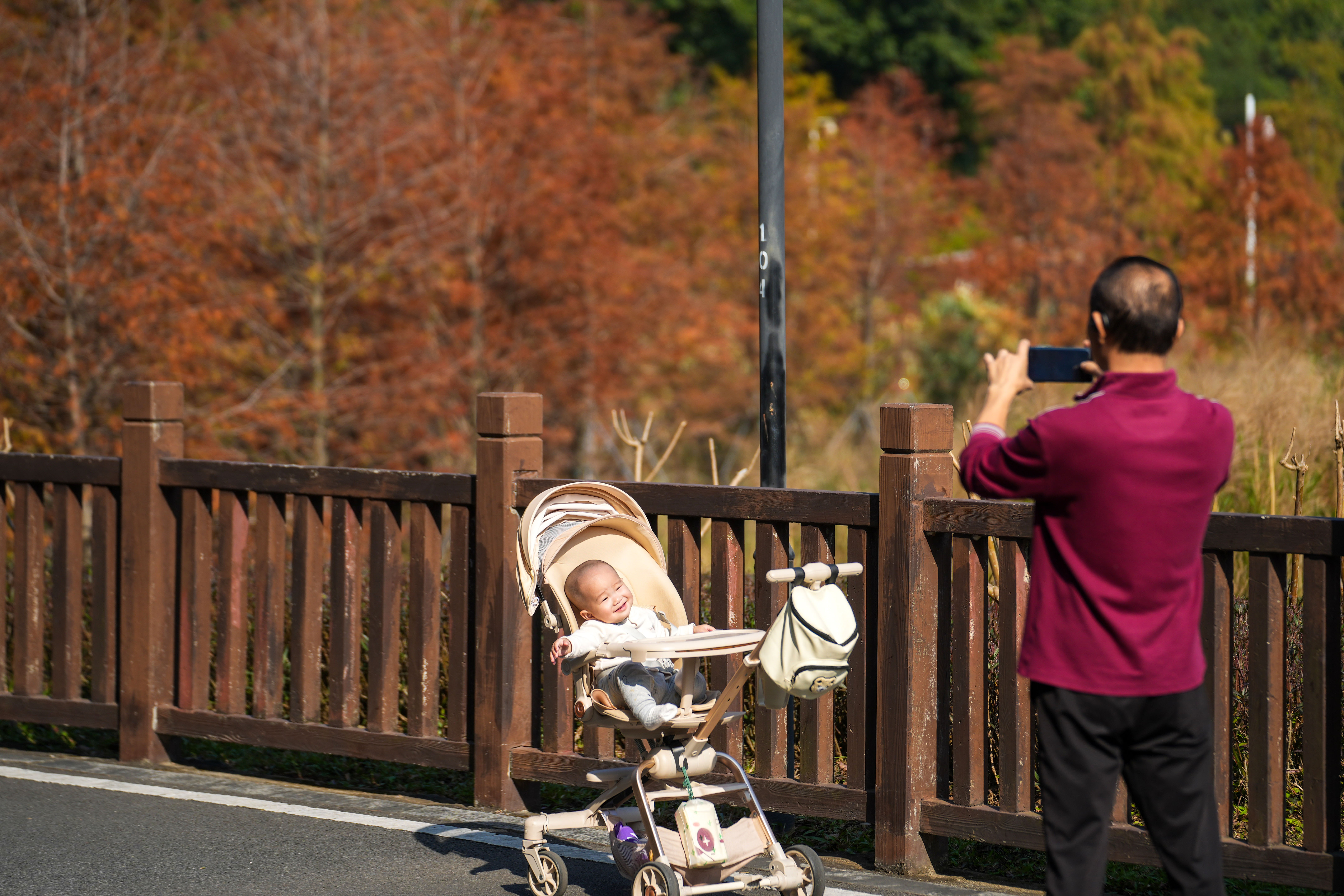 步道旁,一位市民正用手机为婴儿车里的孩子拍照,身后连片的橙红落羽杉成了天然背景板。 “老家这时候早下雪了,在深圳能瞧见的‘季节变化’,就是这树叶慢慢变红的模样!”从东北来深定居的王大爷一边推着孙子,一边笑着对记者说。他每天都会带孩子到离家最近的坪山头陂公园逛一逛,“深圳的公园都好看,就数这儿秋意最浓,看着水边的树一天天变颜色,心里也跟着暖乎。”