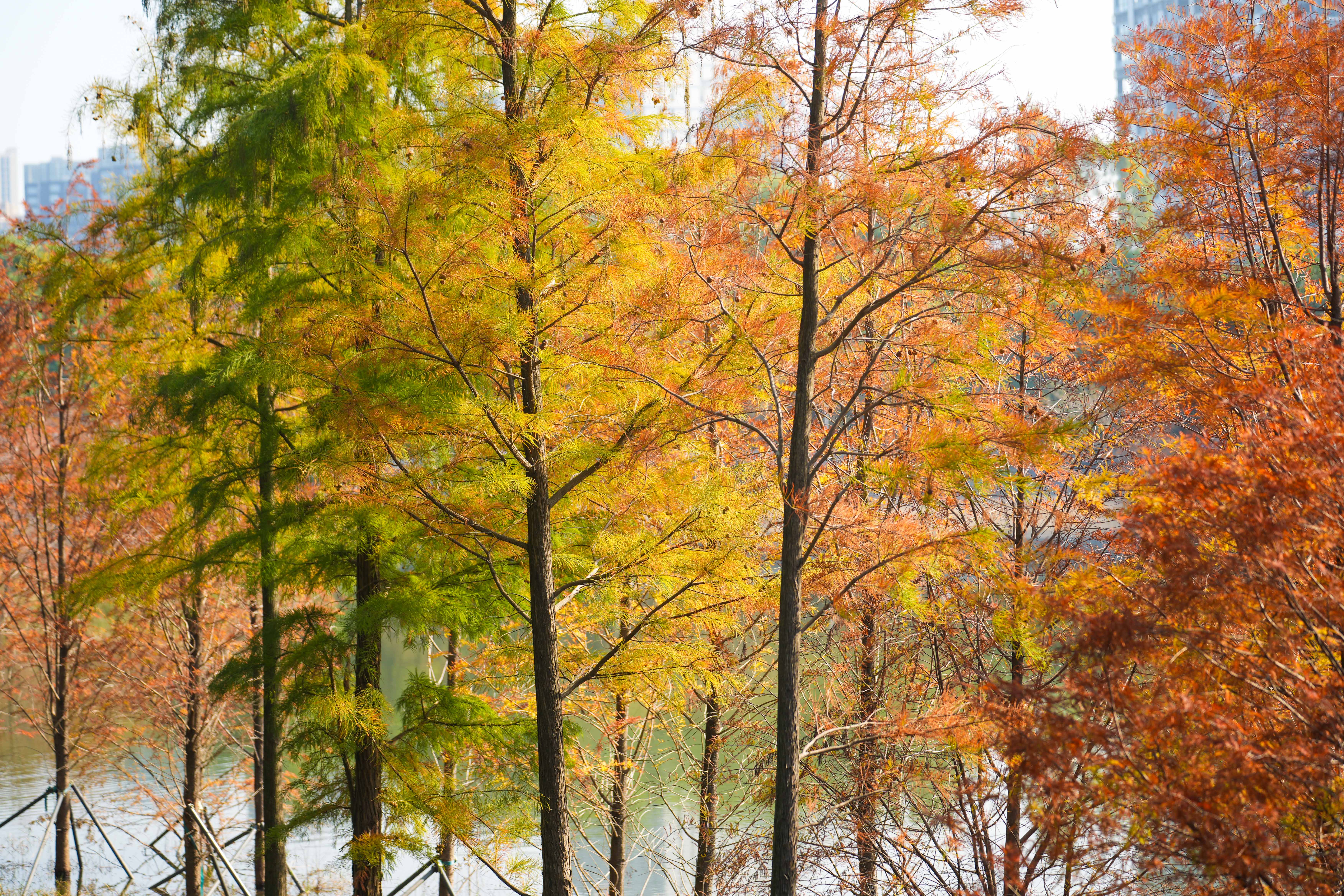 在深圳环西丽湖绿道,秋意正浓。澄澈的湖水边,成片的落羽杉已悄然换上新装——红、橙、黄、绿层层叠叠,在阳光下铺展出一幅“层林尽染”的斑斓画卷。远处山峦叠翠,近处湖水如镜,暖色调的枝叶与水中倒影相映成趣,将秋日的诗意与宁静渲染得淋漓尽致。