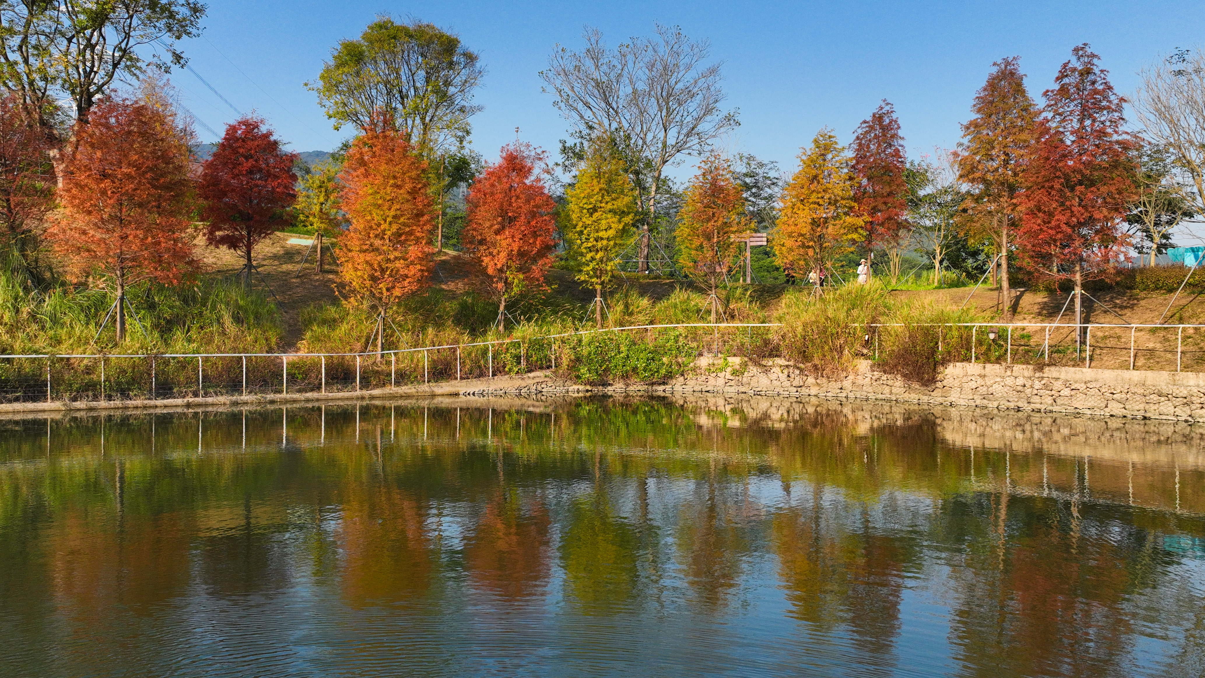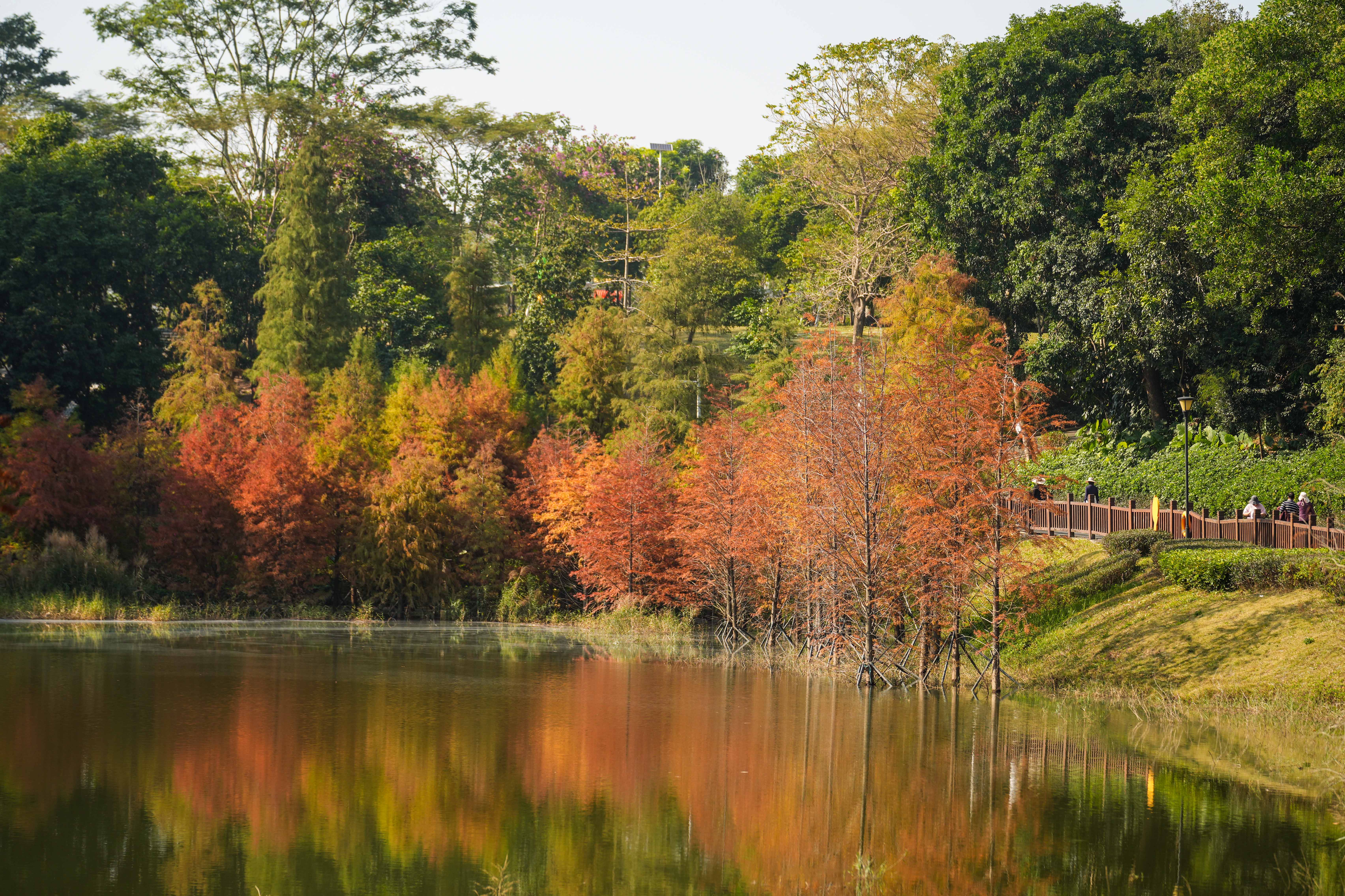 在坪山区头陂公园,几株落羽杉扎根水边,橙红枝叶与水中倒影相映成趣,不少市民围站在岸边。有人蹲身取景拍照,有人结伴驻足赏景,让这片临水秋林成了公园的秋日“焦点”。