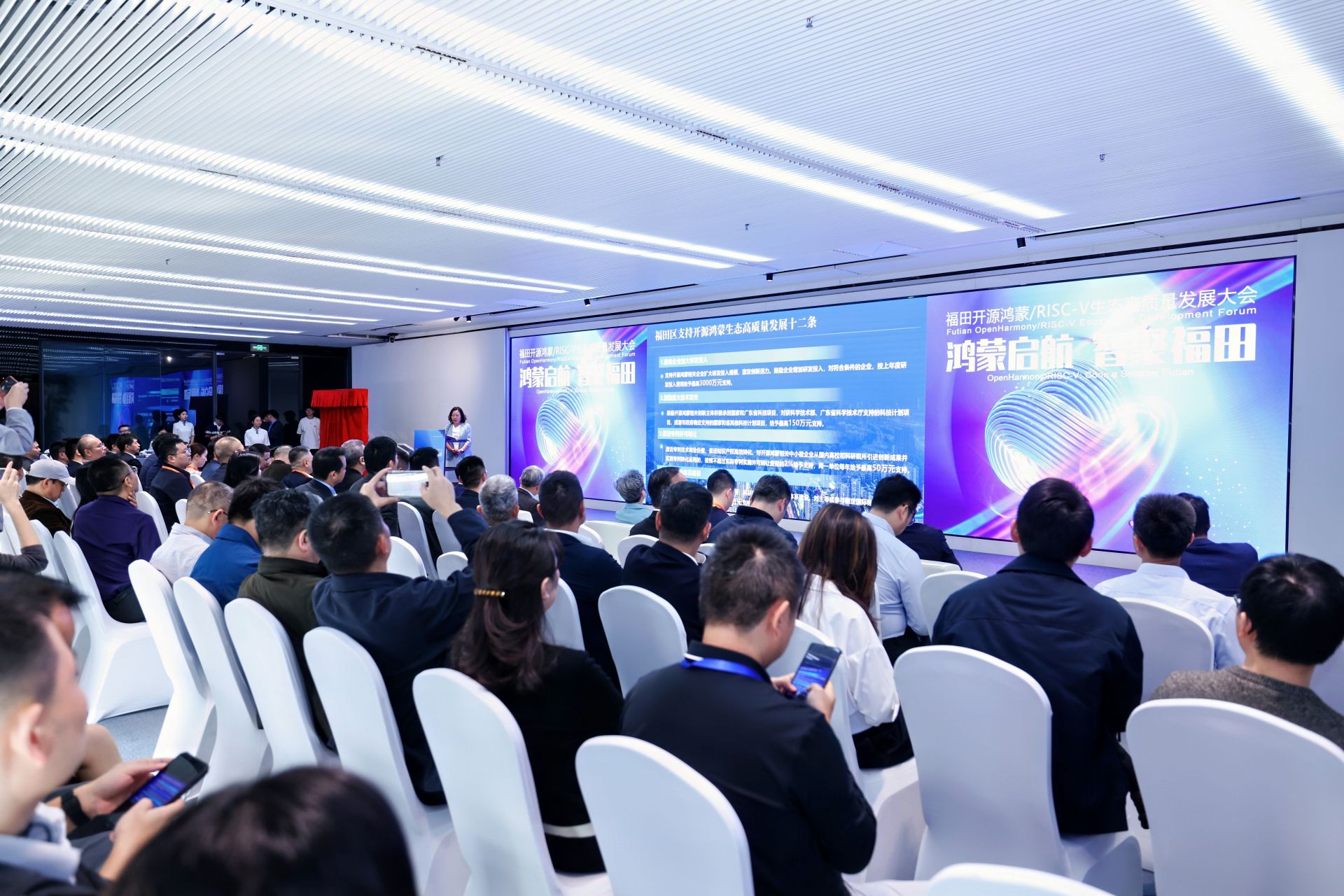 大会伊始,福田区科技和工业信息化局重磅发布《福田区开源鸿蒙专项扶持措施——“福鸿12条”》,围绕技术研发、企业成长、空间保障和人才引育四大维度,推出最高达3000万元的全链条政策支持。