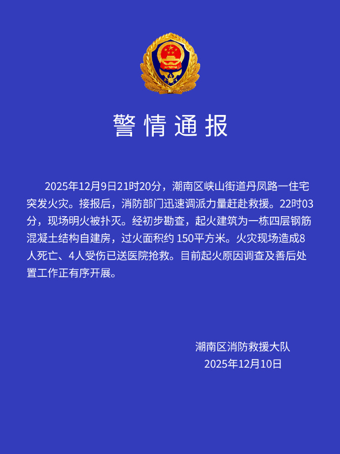 据广东省汕头市潮南区消防救援大队12月10日凌晨发布的警情通报,9日21时20分,潮南区峡山街道丹凤路一住宅突发火灾,造成8人死亡。通报称,接报后,消防部门迅速调派力量赶赴救援。22时03分,现场明火被扑灭。