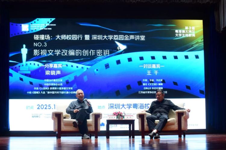 11月2日下午,深圳大学“荔园金声讲堂”暨第三届粤港澳大湾区大学生电影周“碰撞场:电影大师校园行”第三场活动在深圳大学粤海校区国际会议厅举行。第十届茅盾文学奖得主、著名作家梁晓声,第五届鲁迅文学奖获得者、作家兼学者王干受邀担任主讲嘉宾,与现场高校师生、中小学代表及市民朋友们齐聚一堂,围绕“影视文学改编的创作密钥”展开深度对话,解锁文字与影像转化的核心逻辑,为粤港澳大湾区大学生电影周注入浓厚的人文与艺术气息。