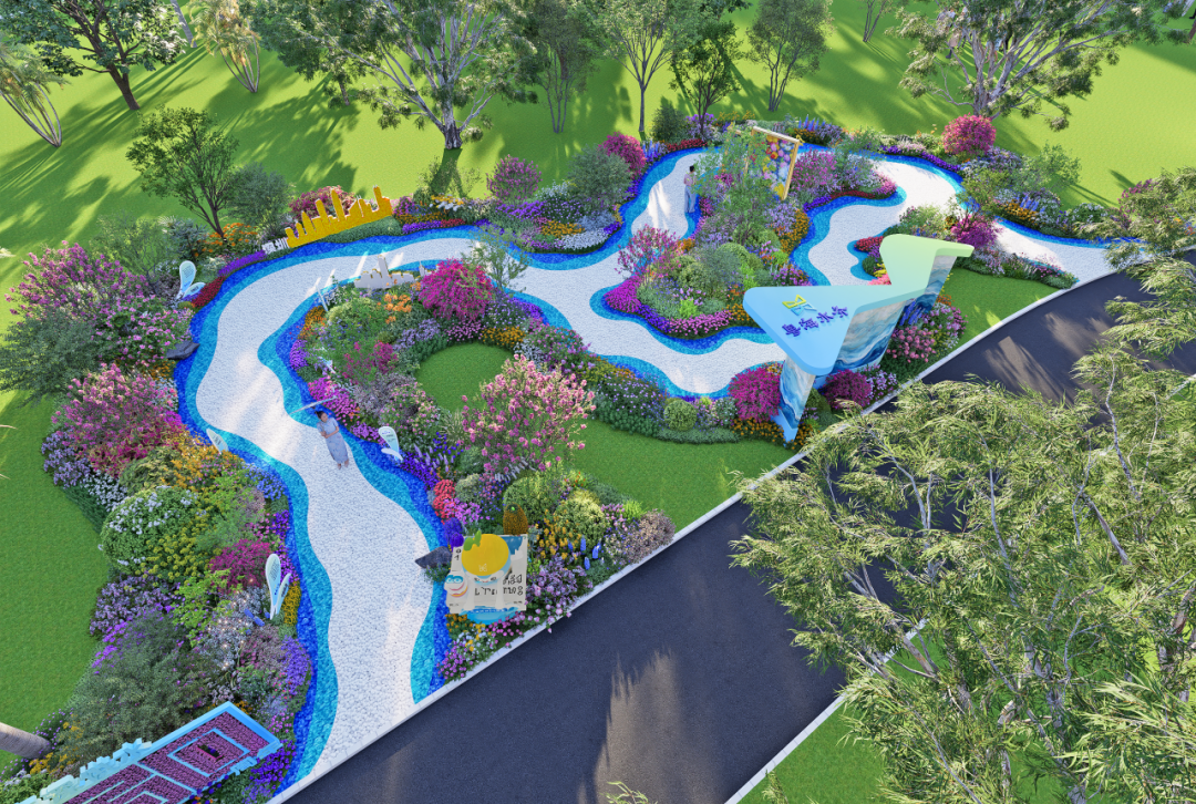 “菊雕梦乐园”以粉蓝植物为基调,设置童趣造型,解锁亲子互动新玩法;