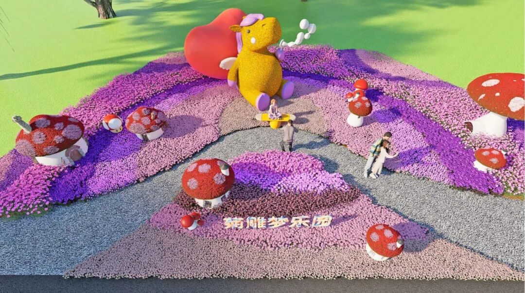 阳光草坪“菊苑仙踪”铺展七彩菊海,搭配花仙子雕塑尽显浪漫;