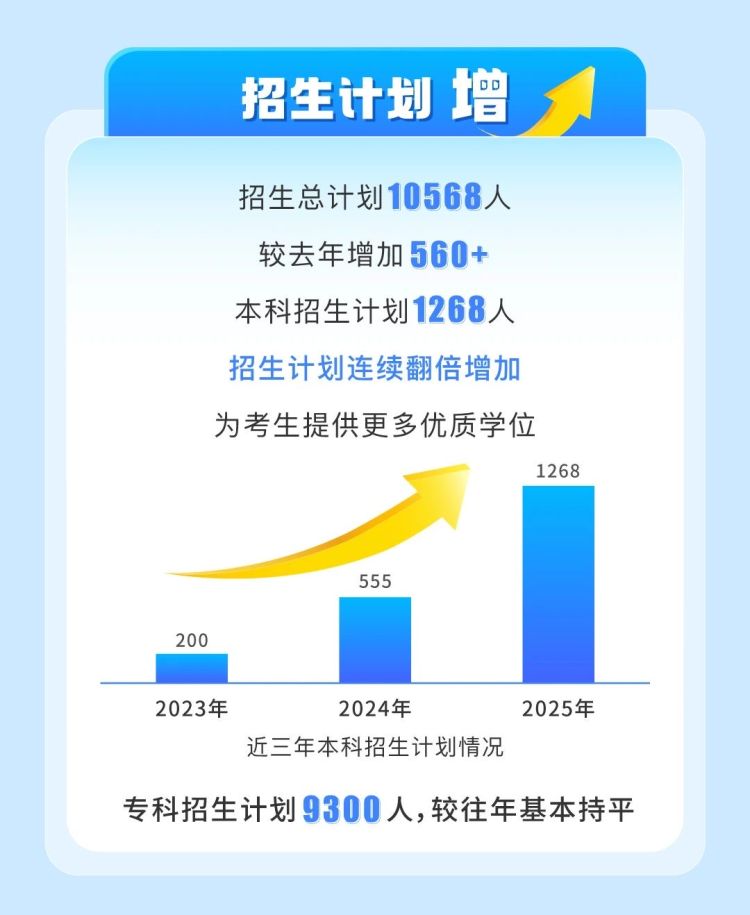2025年,深职大本科招生计划较去年再增一倍,达1268人,专科招生规模稳定在9300人,整体招生计划较2024年净增560余人,进一步满足社会对高素质技能人才的需求。