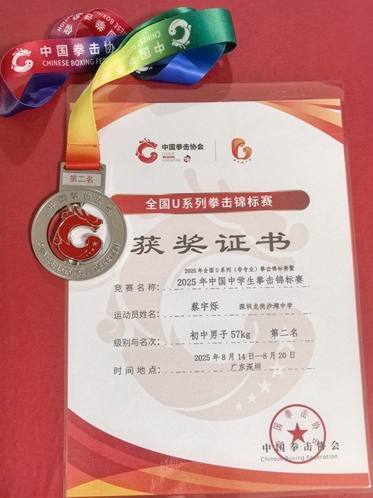 本次赛事由中国学生体育联合会、中国拳击协会联合主办,于2025年8月14日至20日在深圳市龙腾学校举行,吸引了全国多所中学的顶尖选手参赛。比赛现场旌旗飘扬,舞狮助威,观众席上加油声此起彼伏。蔡宇烁同学在擂台上以敏捷的步伐、精准的出拳和坚韧的防守,展现了沙中学子的风采,最终以第二名的优异成绩登上领奖台!