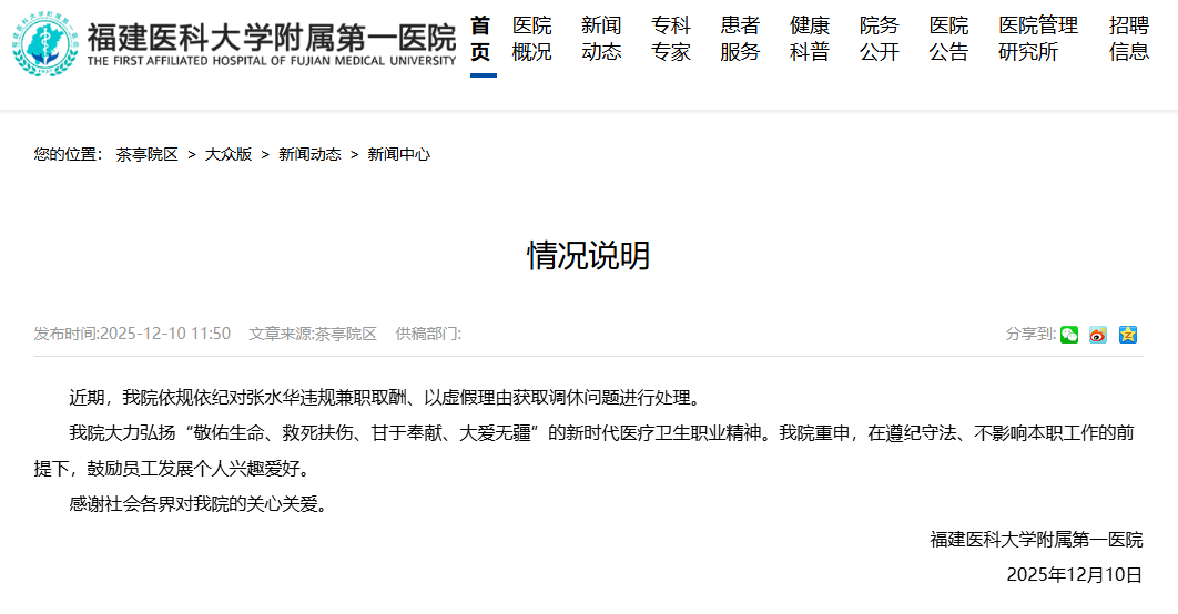 12月10日,福建医科大学附属第一医院官网发布情况通报:近期,我院依规依纪对张水华违规兼职取酬、以虚假理由获取调休问题进行处理。据此前报道,2025年8月底,该医院护士张水华因在哈尔滨马拉松比赛夺冠后,接受采访时哭诉希望单位领导支持其调休参加比赛,引发舆论风波。