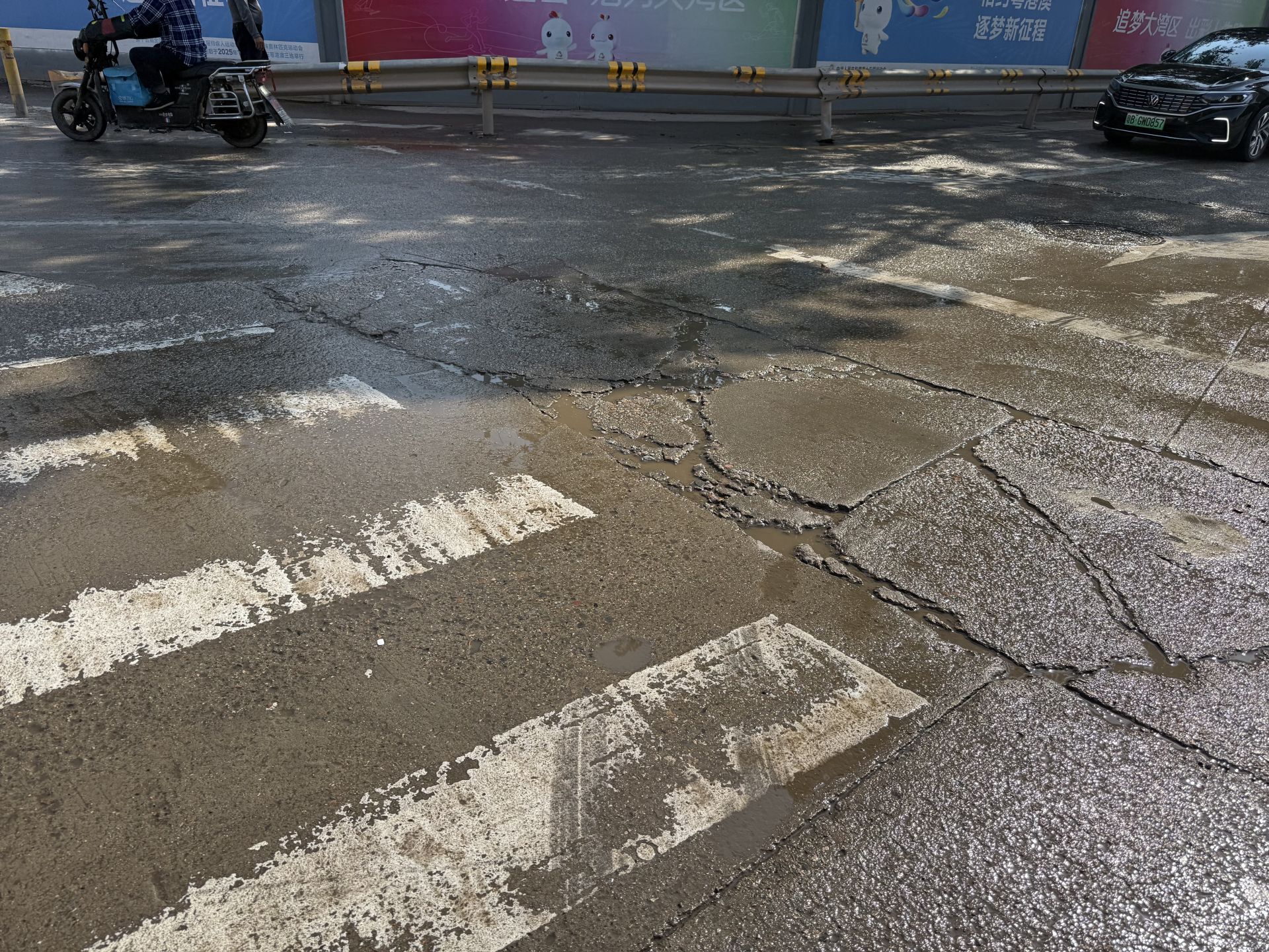 记者观察发现,道路中间虽有修补痕迹,但坑洼依然可见。从燃气井盖向南至人行道一段,路面裂痕明显,车辆经过时颠簸感强。人行道也存在多处修补痕迹,填补处与原有路面衔接不均,导致路面凹凸不平。记者探访时,该路段刚经洒水车作业,路面湿滑,坑洼处形成多处“小水塘”,电动车经过时水花四溅。