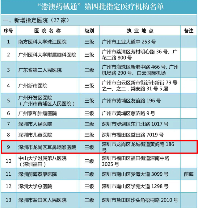 近日,广东省卫生健康委员会与广东省药品监督管理局联合发布粤港澳大湾区“港澳药械通”第四批指定医疗机构名单,深圳市龙岗区耳鼻咽喉医院成功入选,成为深圳市本次新增的7家医疗机构之一,也是目前粤港澳大湾区唯一一家获此资质的三级公立耳鼻咽喉专科医院。